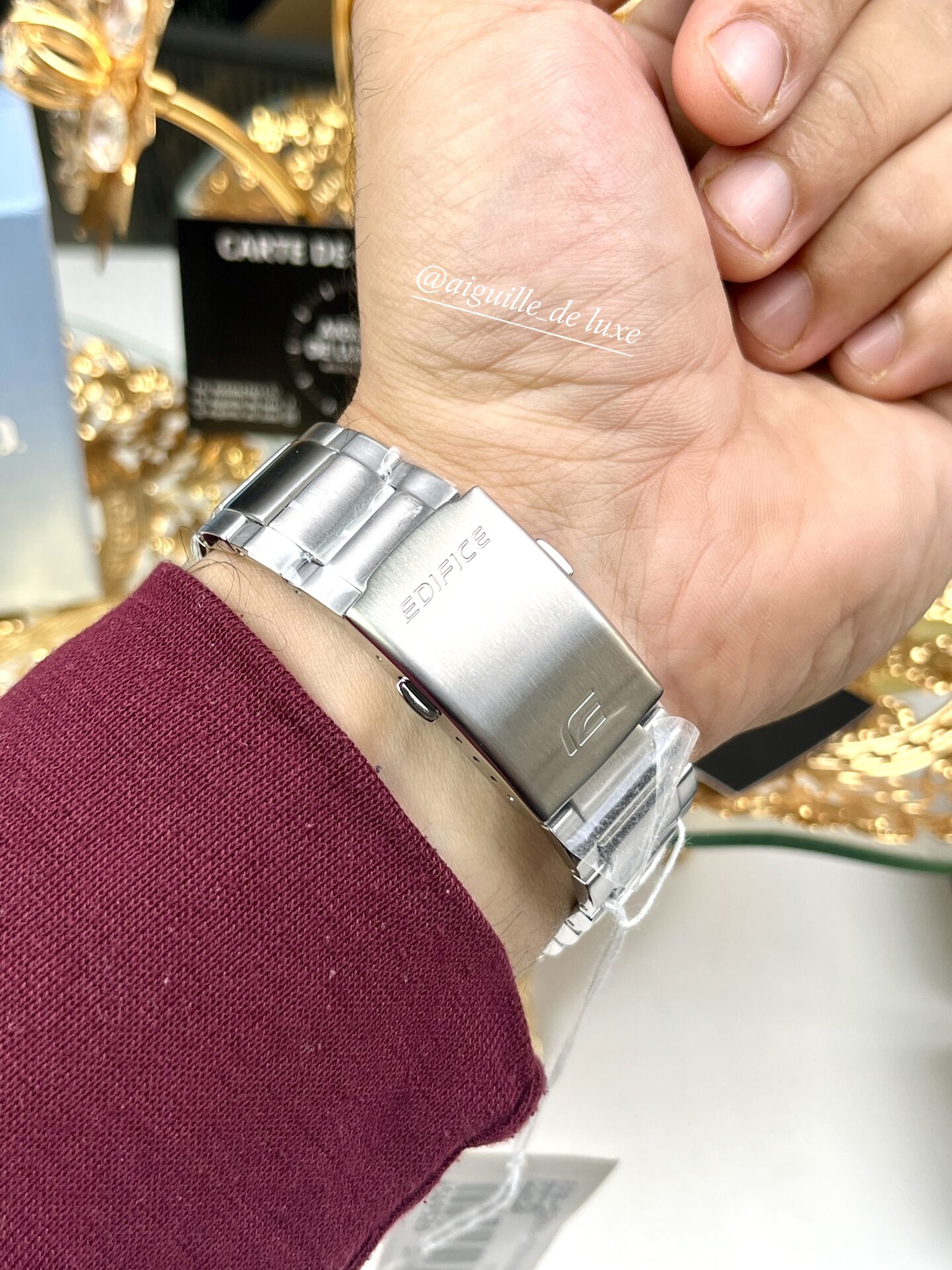 • Résistance à l’eau : 100 m / 10 barLa Casio Edifice EFR-526D-5CV séduit par son élégance contemporaine et sa construction robuste. Le boîtier en acier inoxydable poli s’harmonise avec un cadran rouge-marron au fini “sunburst” qui reflète subtilement la lumière, évoquant un style urbain chic. Les index argentés et les aiguilles sectorielles ajoutent une lisibilité optimale et une finition soignée.