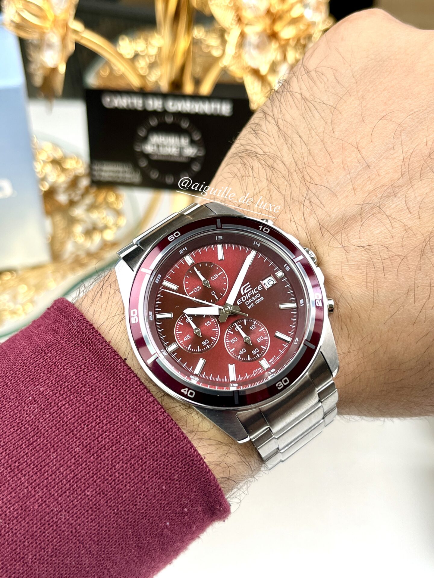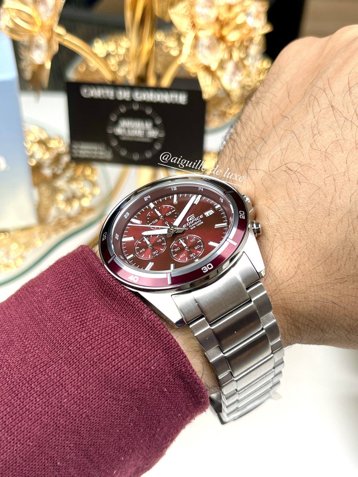 La Casio Edifice EFR-526D-5CV associe un design raffiné et sportif : boîtier en acier inoxydable, bracelet assorti, et cadran rouge-marron à effet soleil qui capte la lumière avec élégance. Elle combine style urbain et fonctionnalités chronographe fiables, idéale pour l’homme moderne qui privilégie distinction et performance.