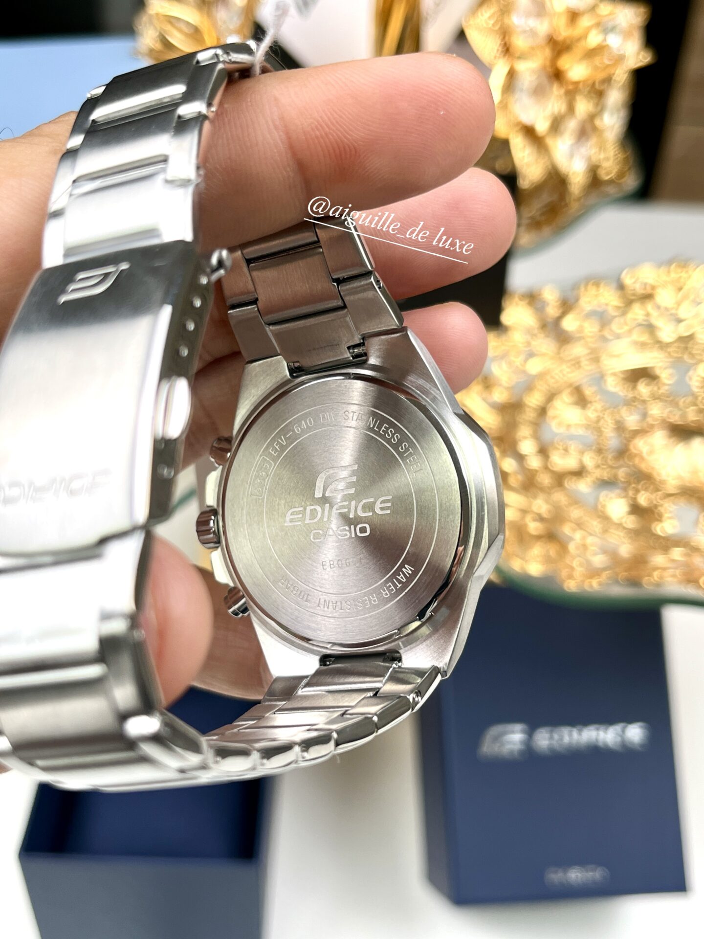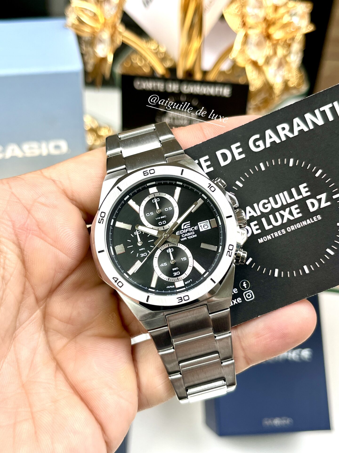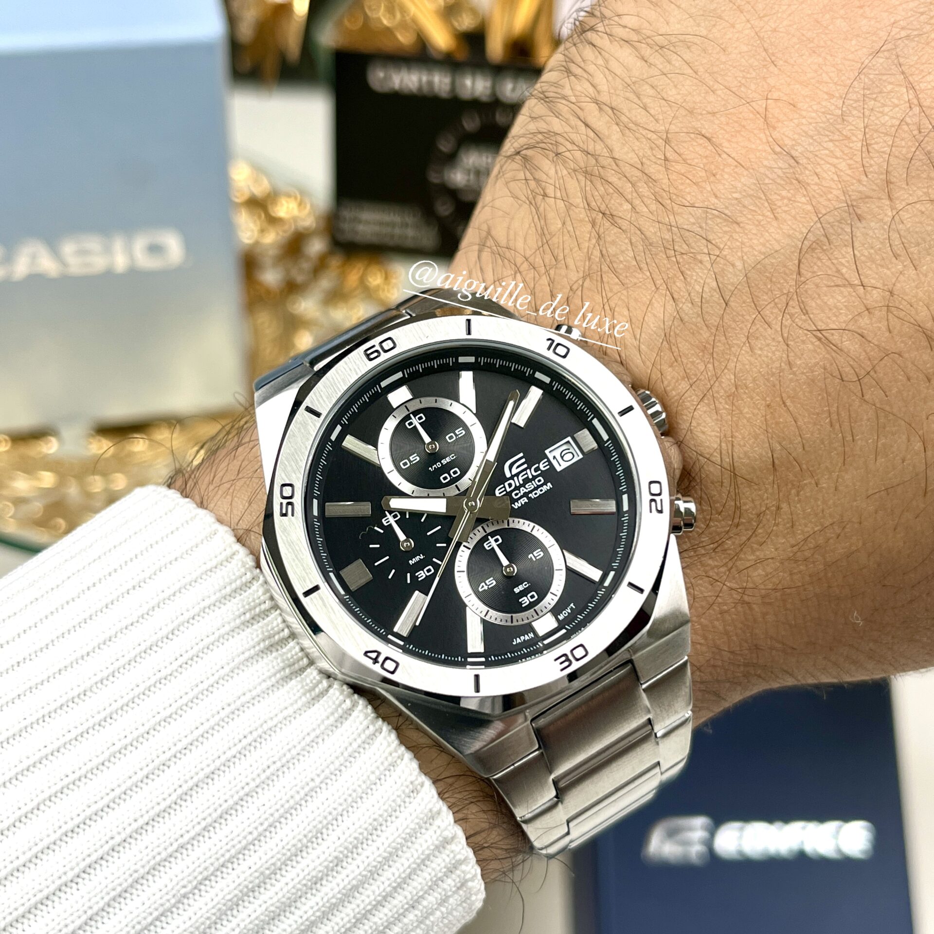 La Casio Edifice EFV-640D-1A se distingue par son design solide et élégant à la fois, mettant en valeur un boîtier en acier inoxydable usiné avec soin et une lunette octogonale subtile qui lui donne une présence marquée au poignet. Le cadran noir, épuré tout en intégrant trois sous-dials chronographes bien positionnés et un affichage date discret, renforce cette esthétique sportive-chic.
