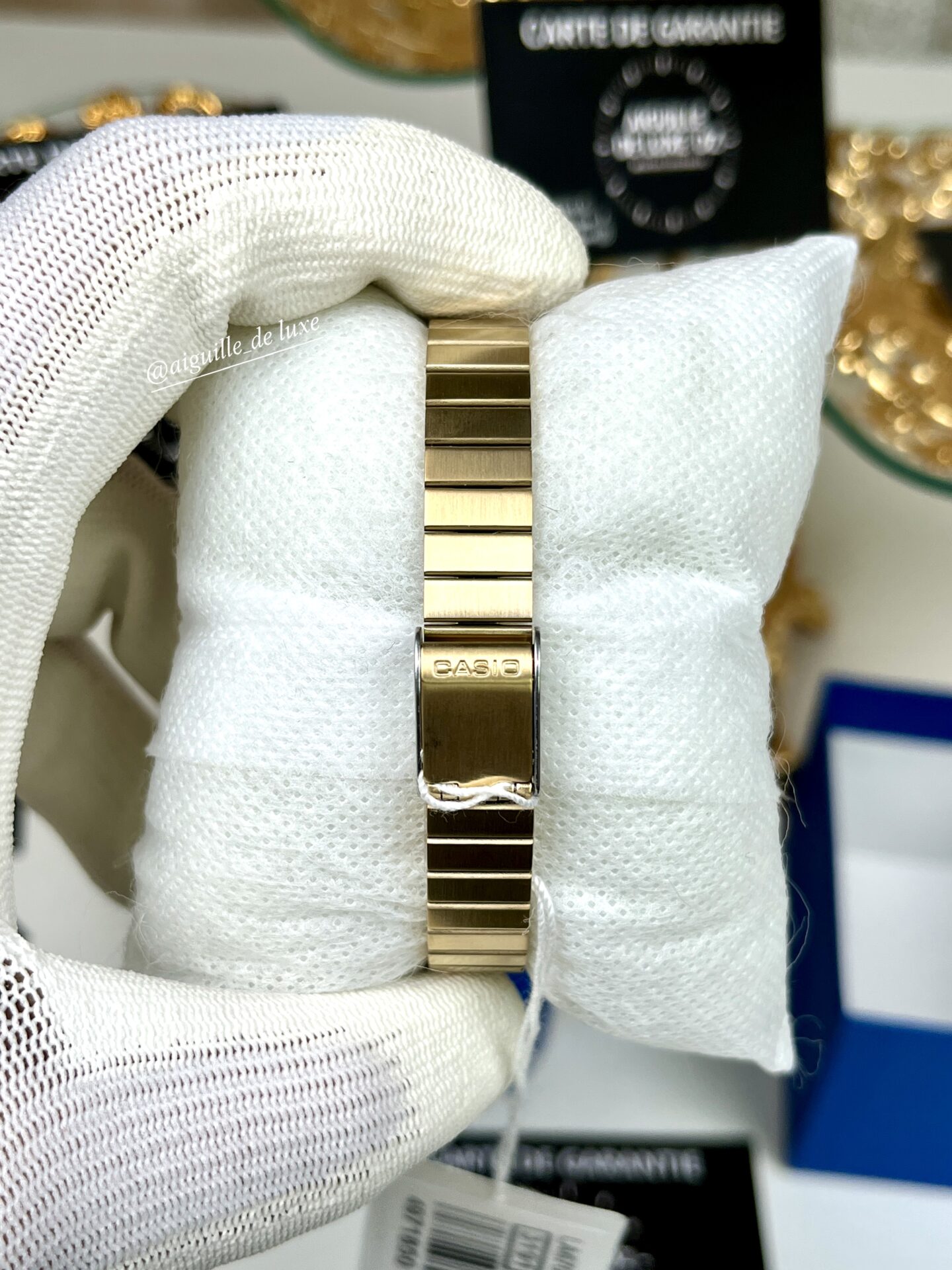 Son bracelet en acier inoxydable doré apporte un aspect chic et durable, avec un fermoir ajustable qui garantit un maintien parfait. Conçue pour le quotidien, la montre bénéficie d’une résistance à l’eau adaptée aux éclaboussures et aux usages courants. Grâce à la qualité de fabrication Casio, ce modèle combine élégance, légèreté et praticité, représentant un excellent choix pour celles qui recherchent une montre à la fois tendance et fonctionnelle.