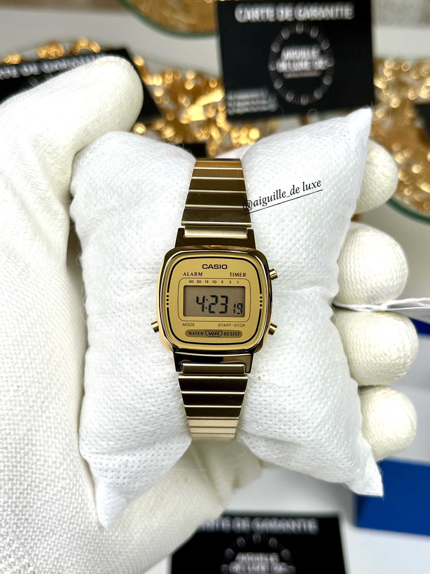 La Casio LA670WGA-9D reprend le charme des montres rétro au format mini, avec une finition dorée élégante qui lui confère une allure raffinée et intemporelle. Son boîtier compact et fin assure un port très confortable, parfaitement adapté aux poignets fins et aux styles délicats. L’affichage digital clair permet une lecture rapide de l’heure et des fonctions essentielles, tout en conservant un style discret et féminin.