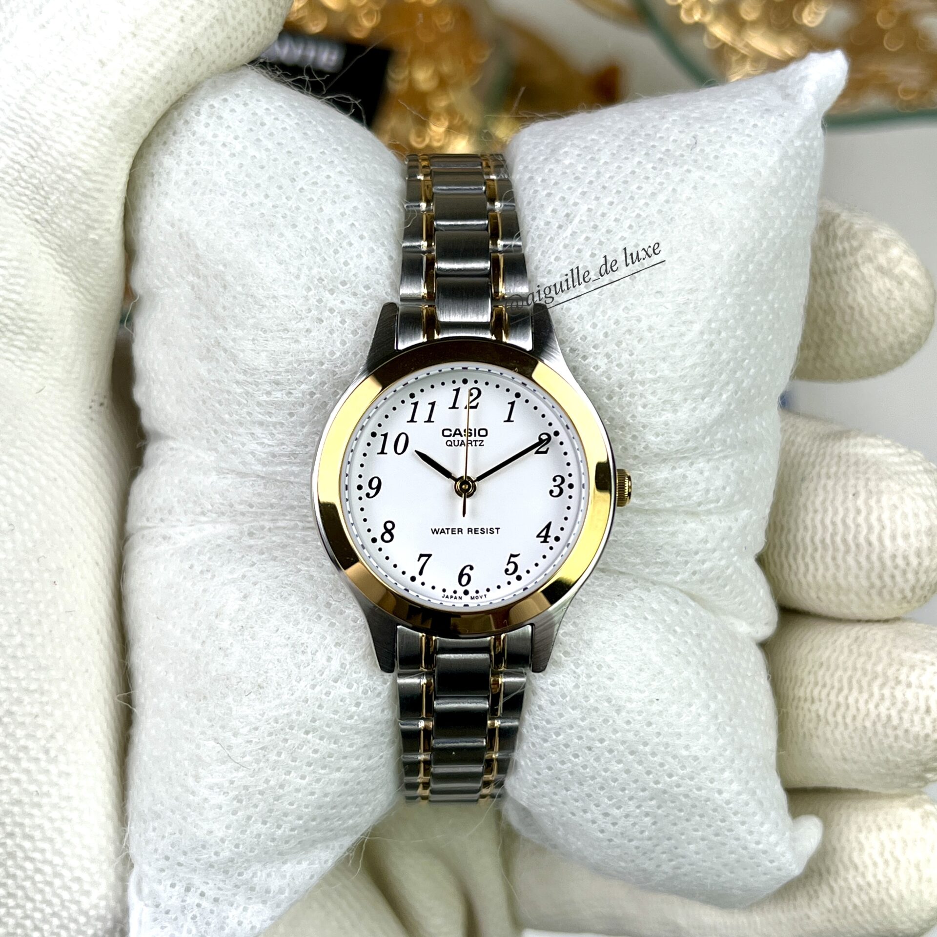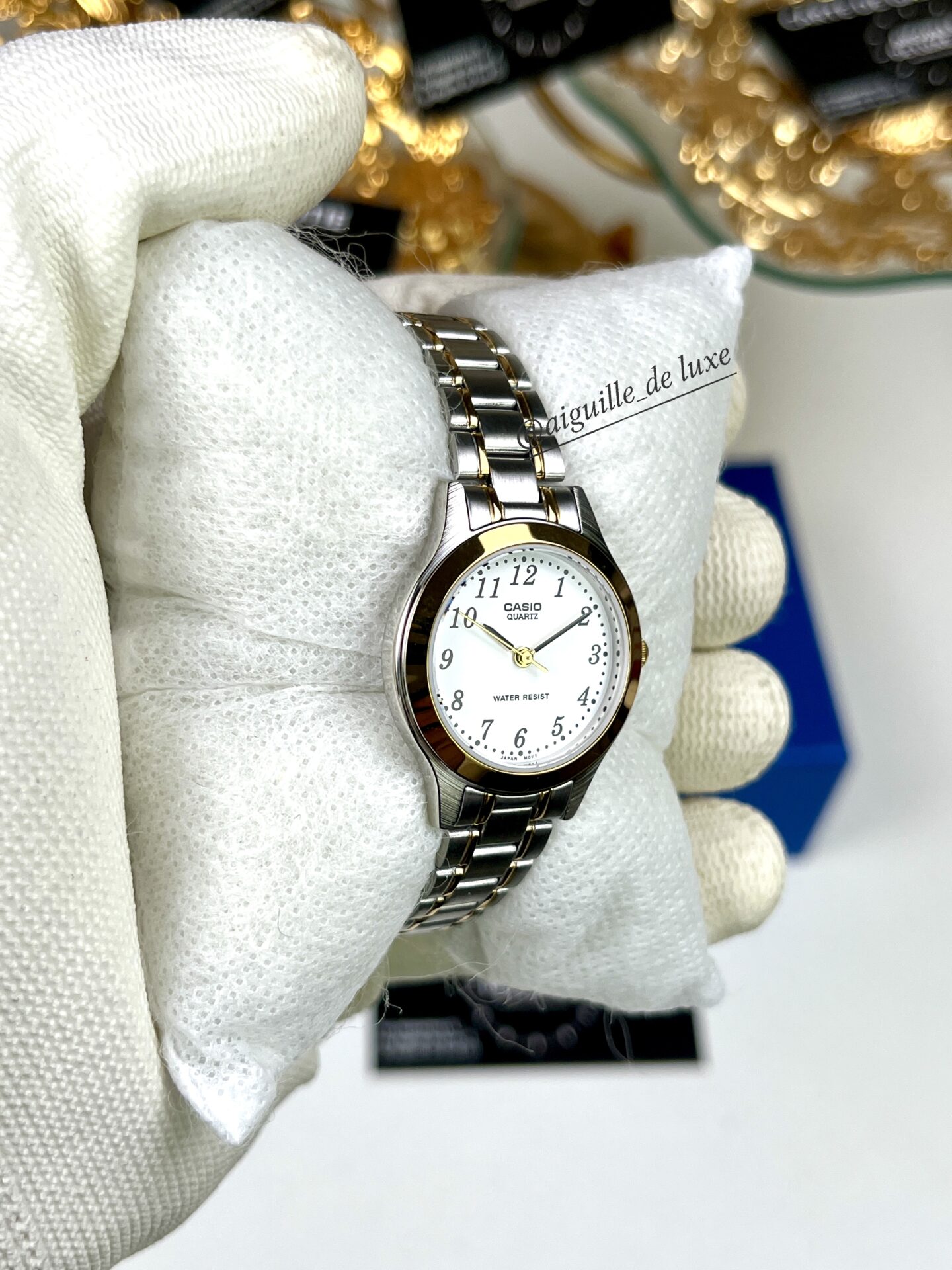 La Casio LTP-1128G-7B est une montre analogique conçue pour les femmes qui apprécient les accessoires à la fois élégants et pratiques. Elle se distingue par sa silhouette fine et son boîtier rond en acier inoxydable avec finition argentée et dorée, qui lui confère un look polyvalent adaptable à toutes les tenues.