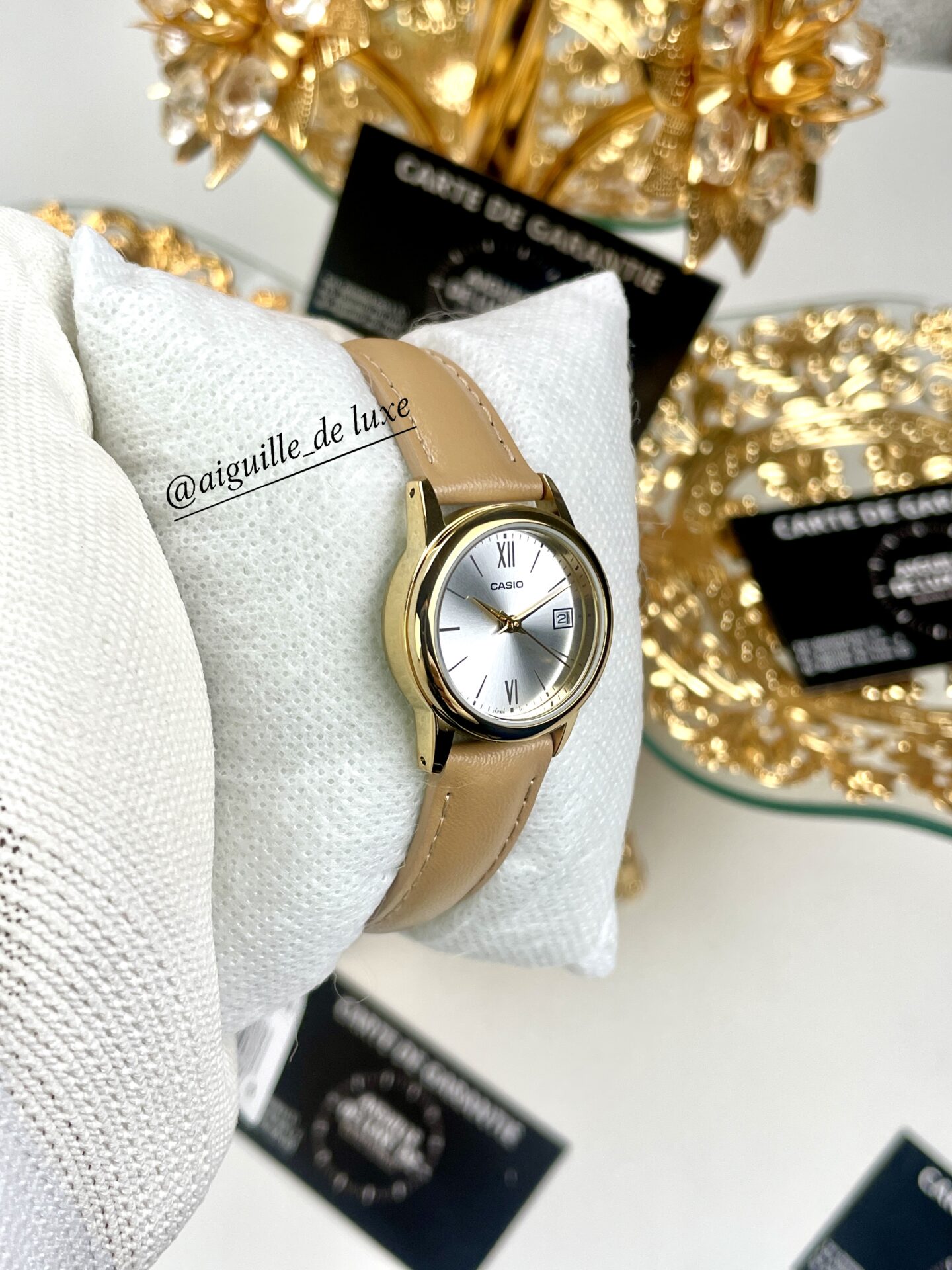 • Résistance à l’eau : 30 mLa Casio LTP-V002GL-7B3 séduit par son esthétique féminine raffinée et son design classique. Son cadran clair, souligné par des index dorés subtils, offre une lecture facile et élégante de l’heure, tandis que le boîtier en acier inoxydable doré lui confère une allure sophistiquée et durable.