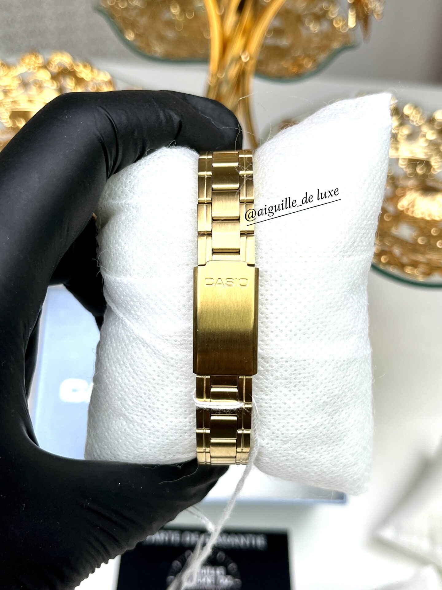 La Casio LTP-V005G-7B se distingue par sa silhouette fine et élégante : un boîtier de 34 mm de haut et 28,2 mm de large, avec une épaisseur contenue de 7,5 mm, ce qui lui permet de se porter aisément au poignet sans compromis sur la présence. La finition plaquée or ion-plated de l’acier inoxydable confère à cette montre un aspect raffiné et lumineux, adapté à toutes les occasions.