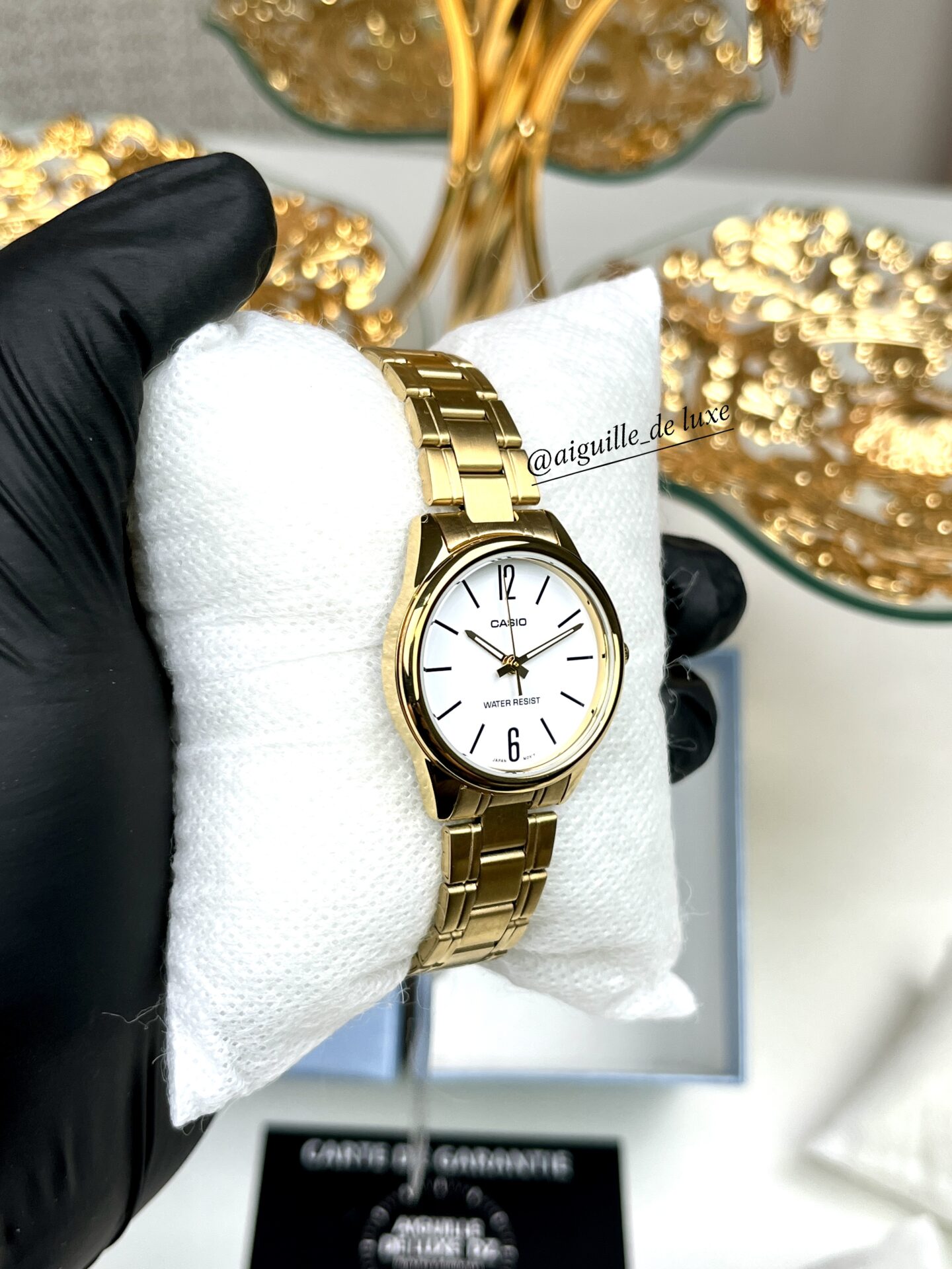 La Casio LTP-V005G-7B combine une finition dorée raffinée à un design discret et confortable : boîtier plaqué or, bracelet acier doré, cadran blanc épuré. Une montre idéale pour la femme recherchant un accessoire élégant, fiable et polyvalent au quotidien.