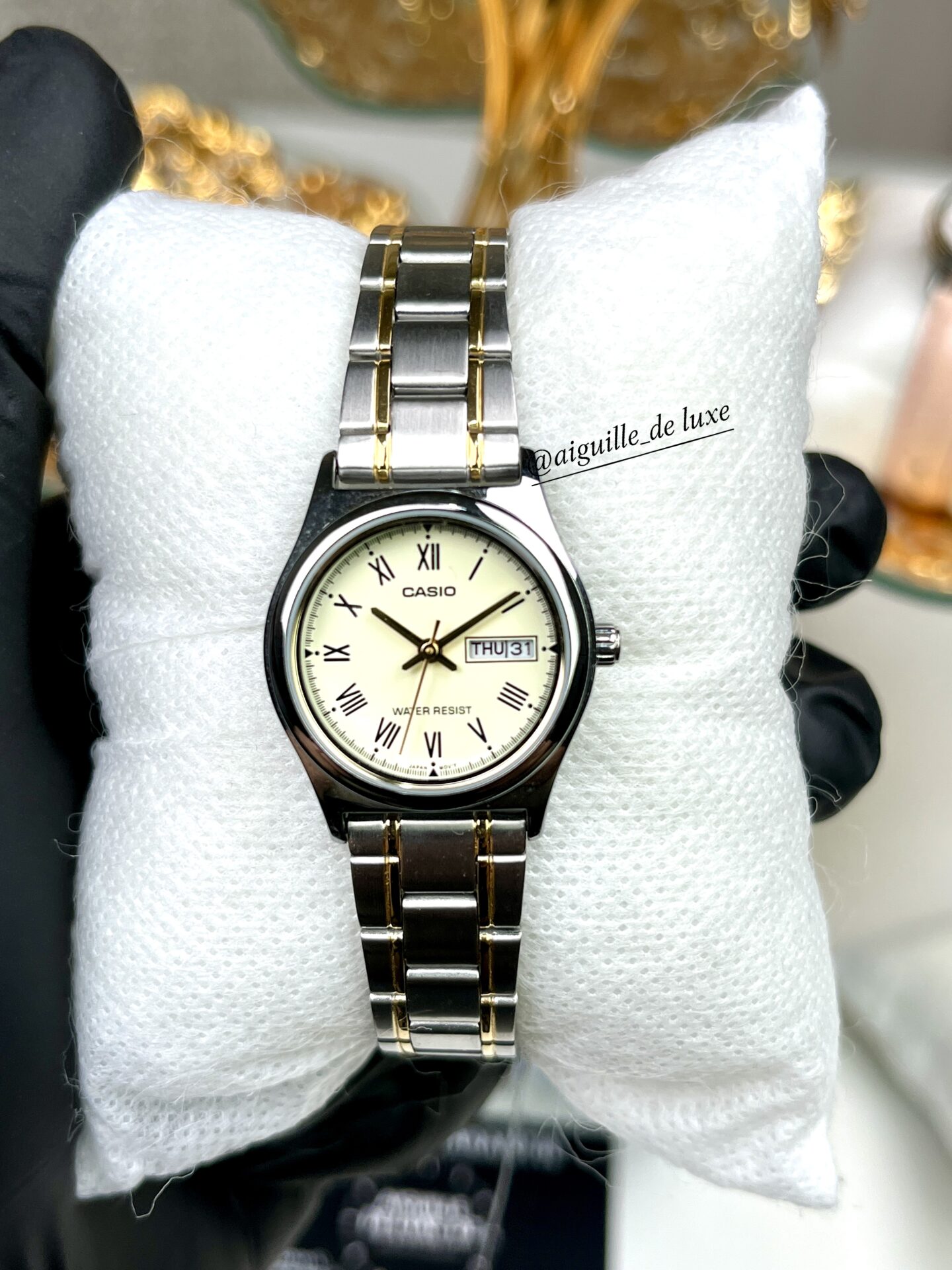 La Casio LTP-V006SG-9B se distingue par une esthétique élégante et raffinée, idéale pour une montre féminine qui ne sacrifie ni la robustesse ni le confort. Son cadran doré exhale une luminosité chaleureuse, parfaitement mise en valeur par le boîtier en acier poli et les touches dorées du bracelet bicolore. Le bracelet en acier inoxydable bicolore offre une finition soignée et une bonne durabilité, tout en garantissant un maintien confortable autour du poignet.