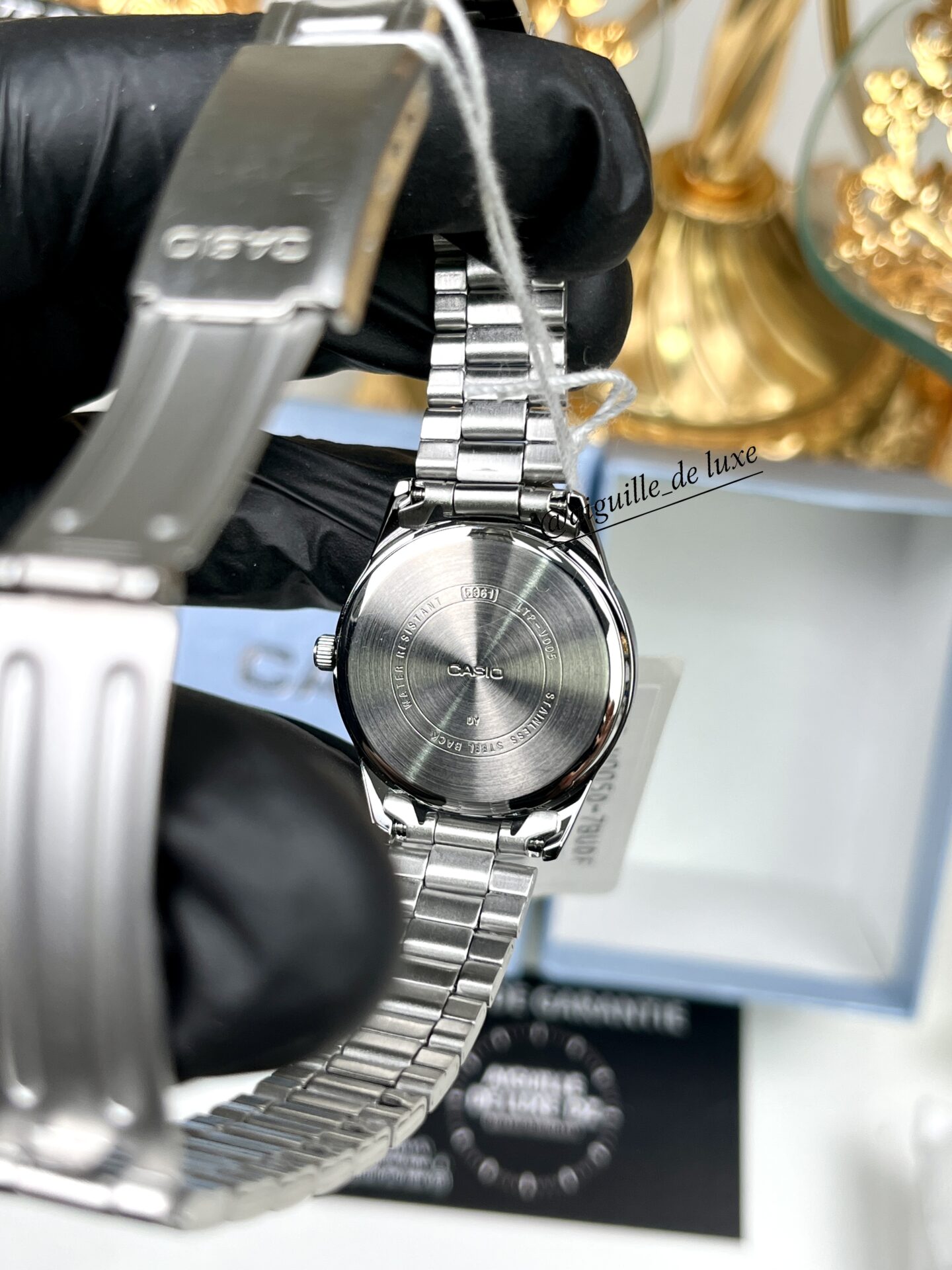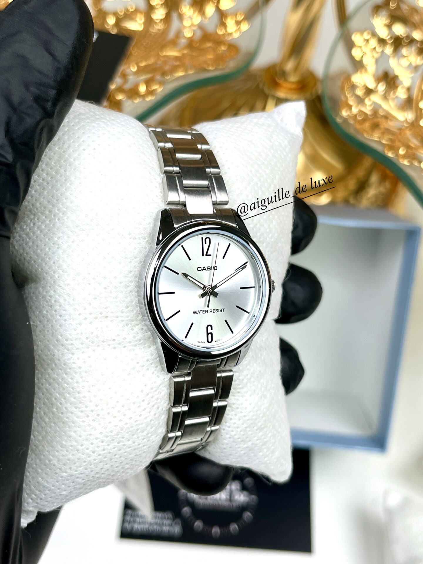 La Casio LTP-V005D-7B allie raffinement et simplicité avec un boîtier et bracelet en acier inoxydable poli, un cadran clair épuré et un design fin adapté à un usage quotidien. Elle incarne à la fois élégance et robustesse dans un format léger.