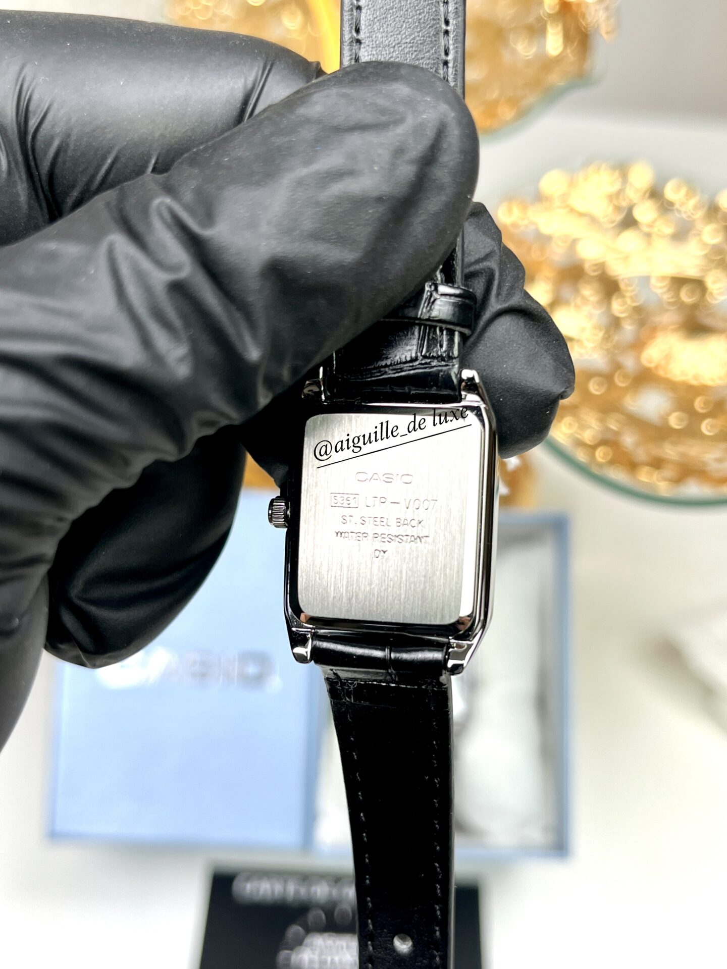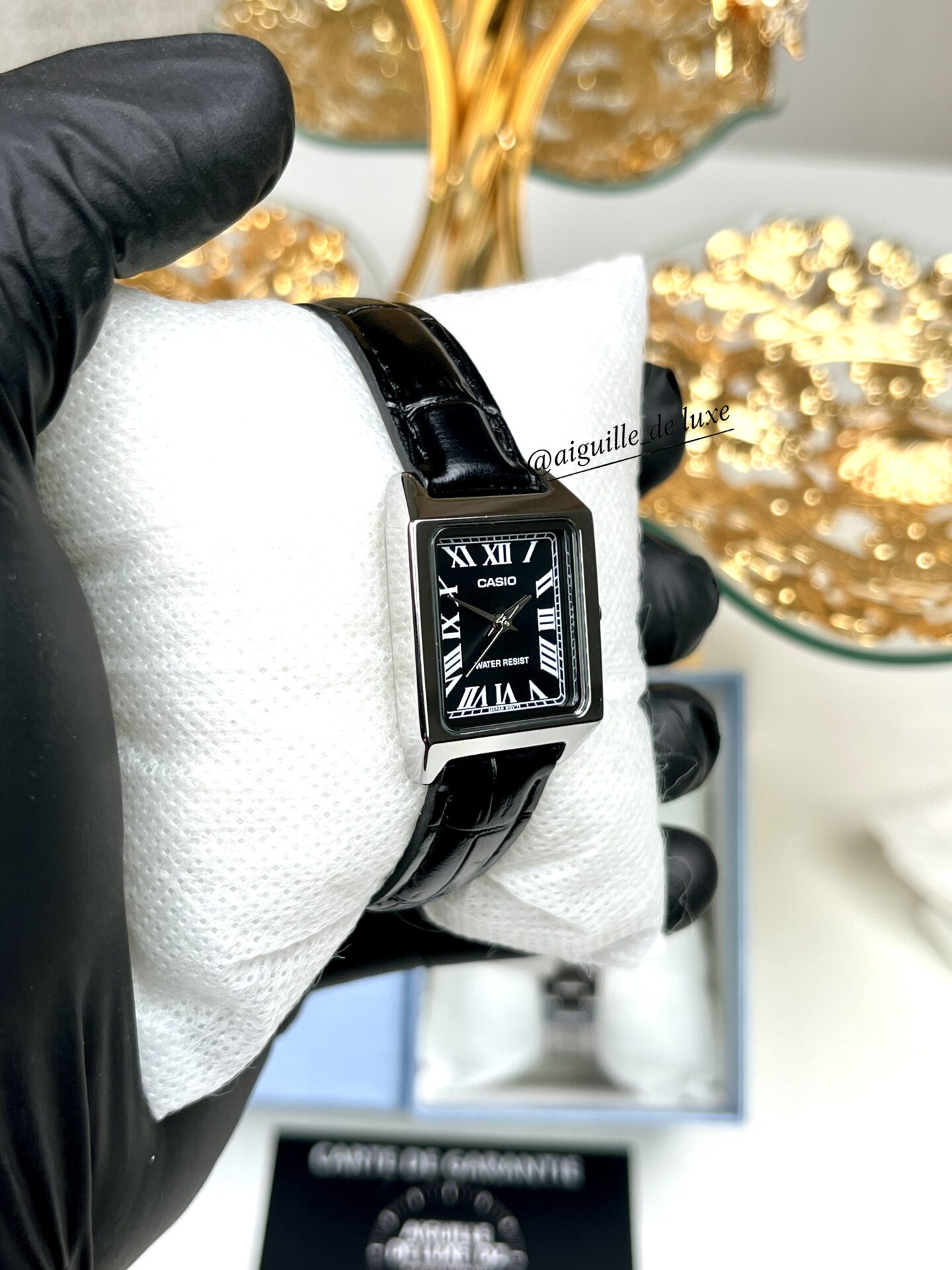 La montre Casio LTP-V007L-1B incarne l’élégance discrète et la qualité que l’on attend de la marque. Le cadran noir offre un contraste marqué avec les finitions chromées du boîtier, ce qui renforce la lisibilité tout en conservant une présence raffinée au poignet. Le boîtier, de dimensions compactes (≈ 31 × 22 mm) et d’épaisseur réduite (≈ 7,5 mm), fait de cette montre un modèle léger, adapté aux poignets féminins et à un port confortable.