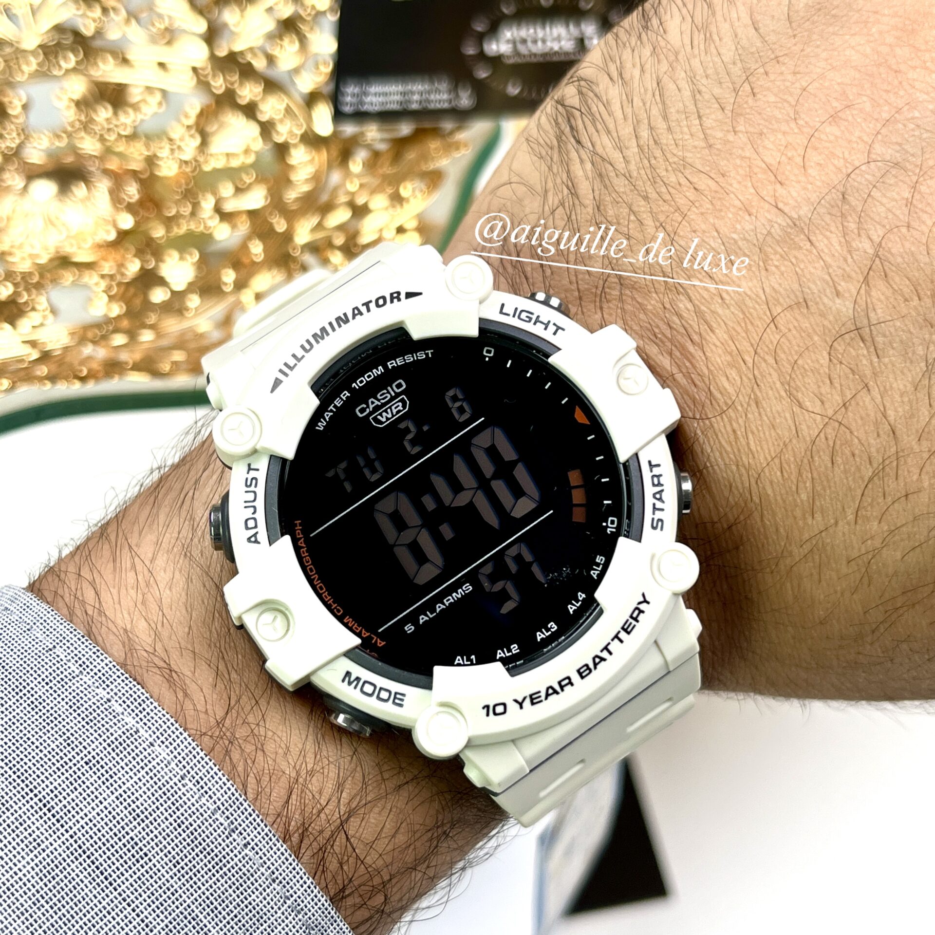 La Casio Homme AE 1500WH 8B2 fait forte impression avec son large cadran digital ultra lisible, idéal pour une consultation rapide et efficace de l’heure. Son boîtier généreux de 54,4 × 51,2 × 15,7 mm et son poids raisonnable de 57 g lui confèrent une présence affirmée tout en restant confortable au poignet.
