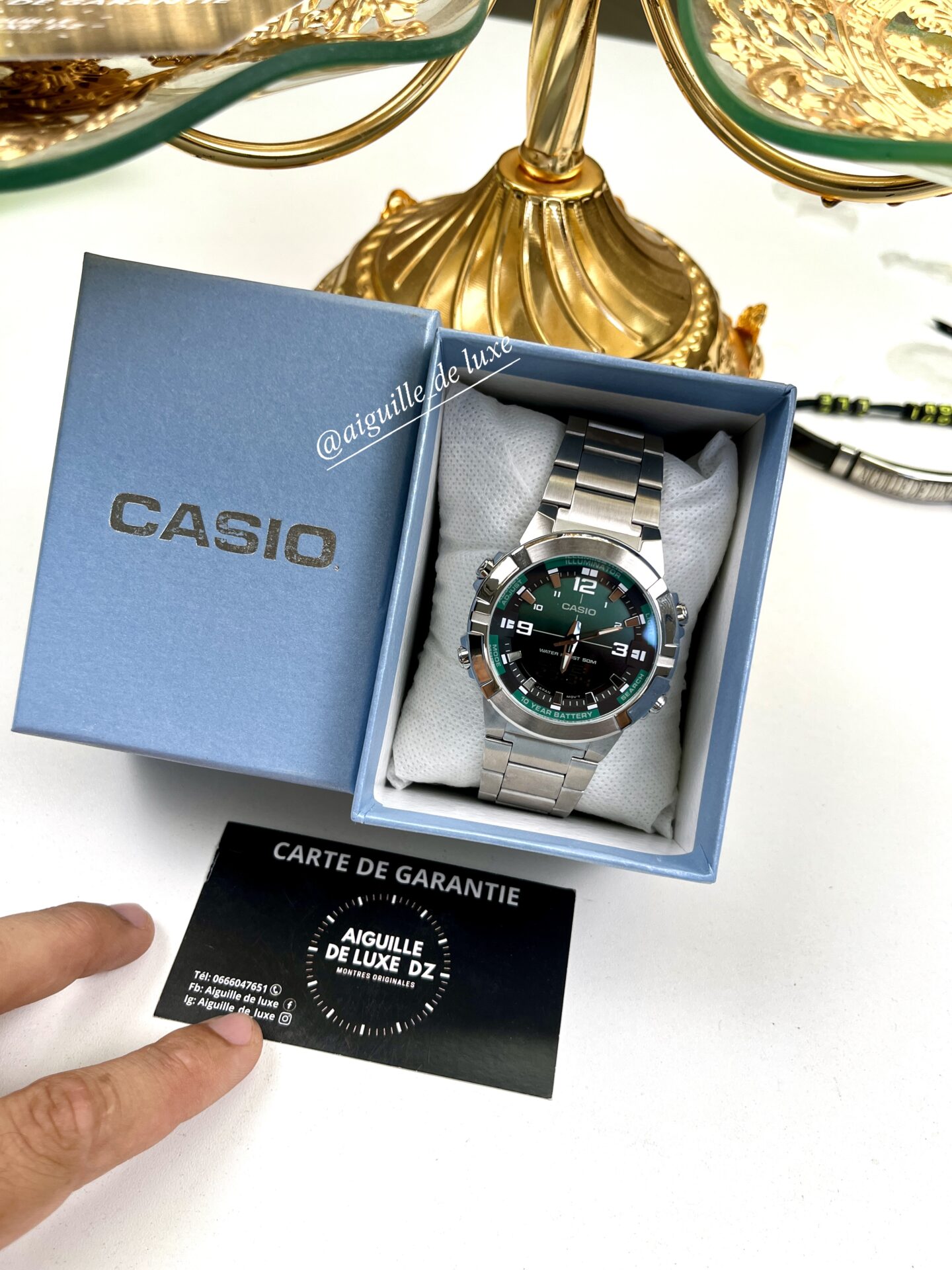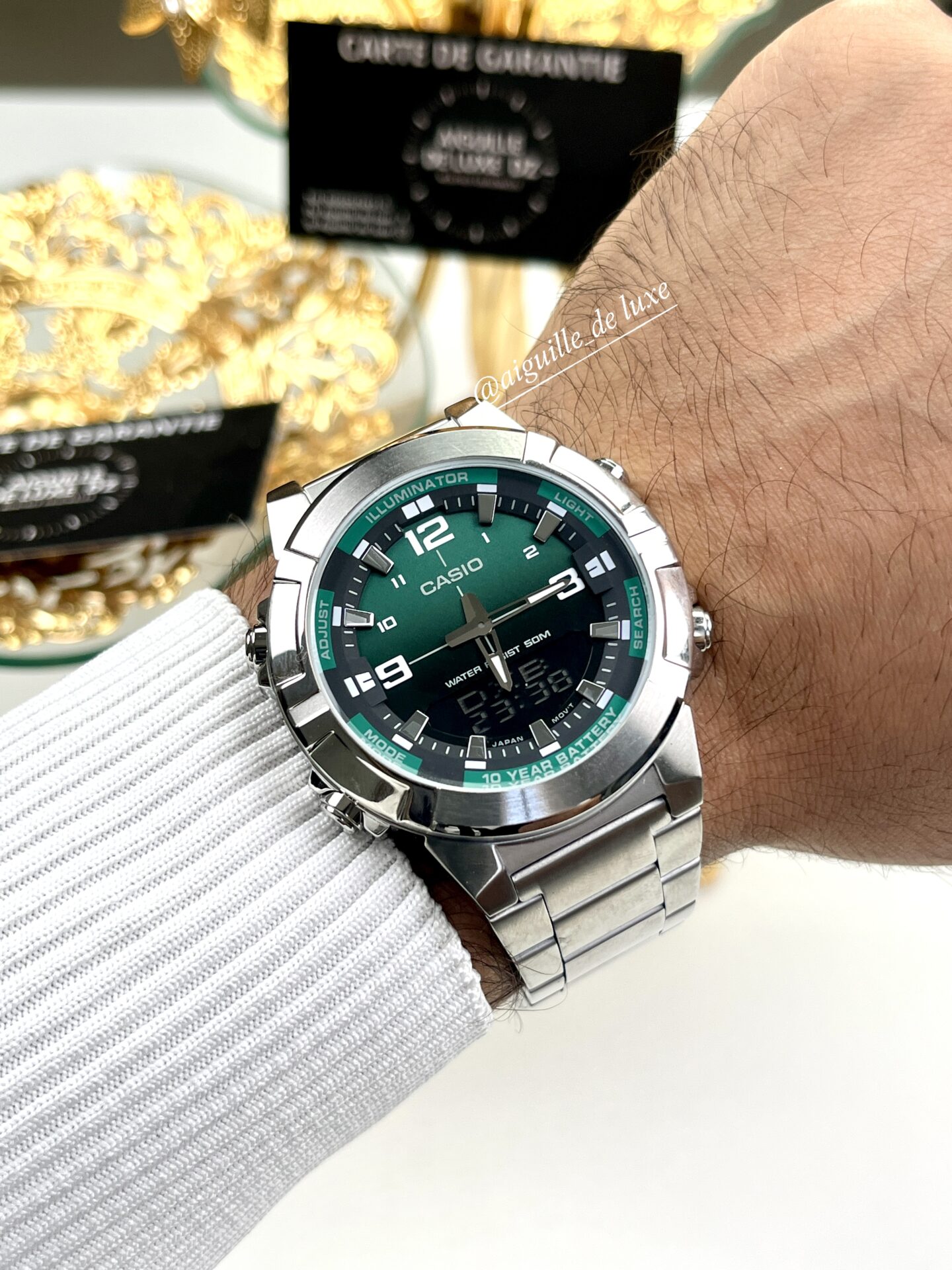La Casio AMW-870DA-3A combine l’élégance d’un cadran analogique à la praticité d’un affichage digital intégré. Elle propose un design robuste en acier inoxydable, des fonctions avancées (chronomètre, alarme, world time…) et une autonomie remarquable — un modèle polyvalent qui allie style et utilité.