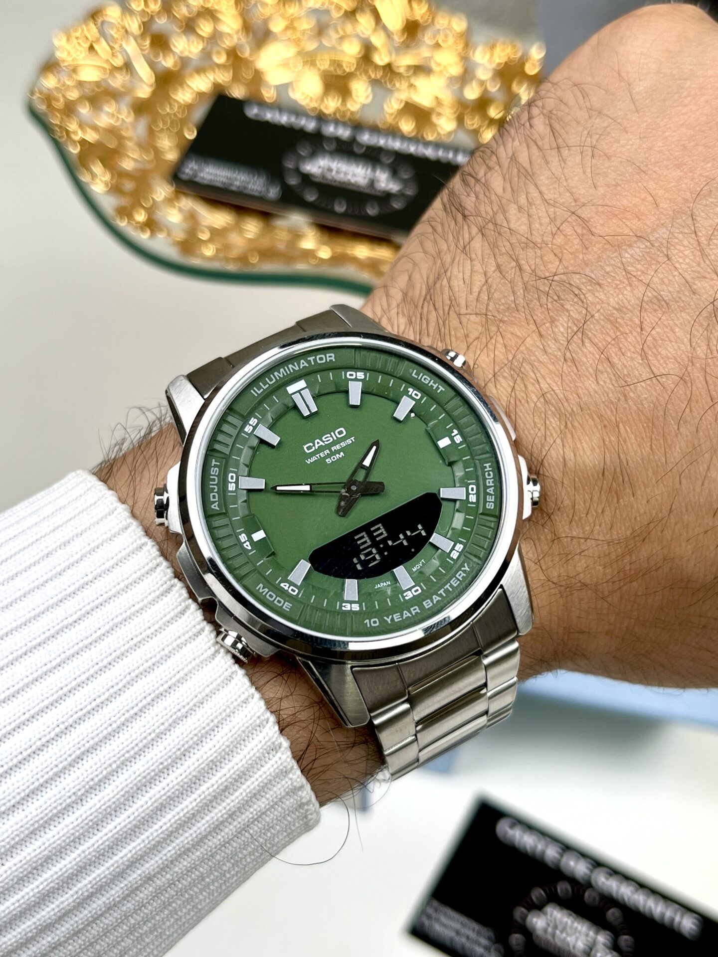 Casio Homme AMW-880D-3A Elégant Cadran Vert Analogique Digitale Acier Inoxydable Autonomie 10 Ans
