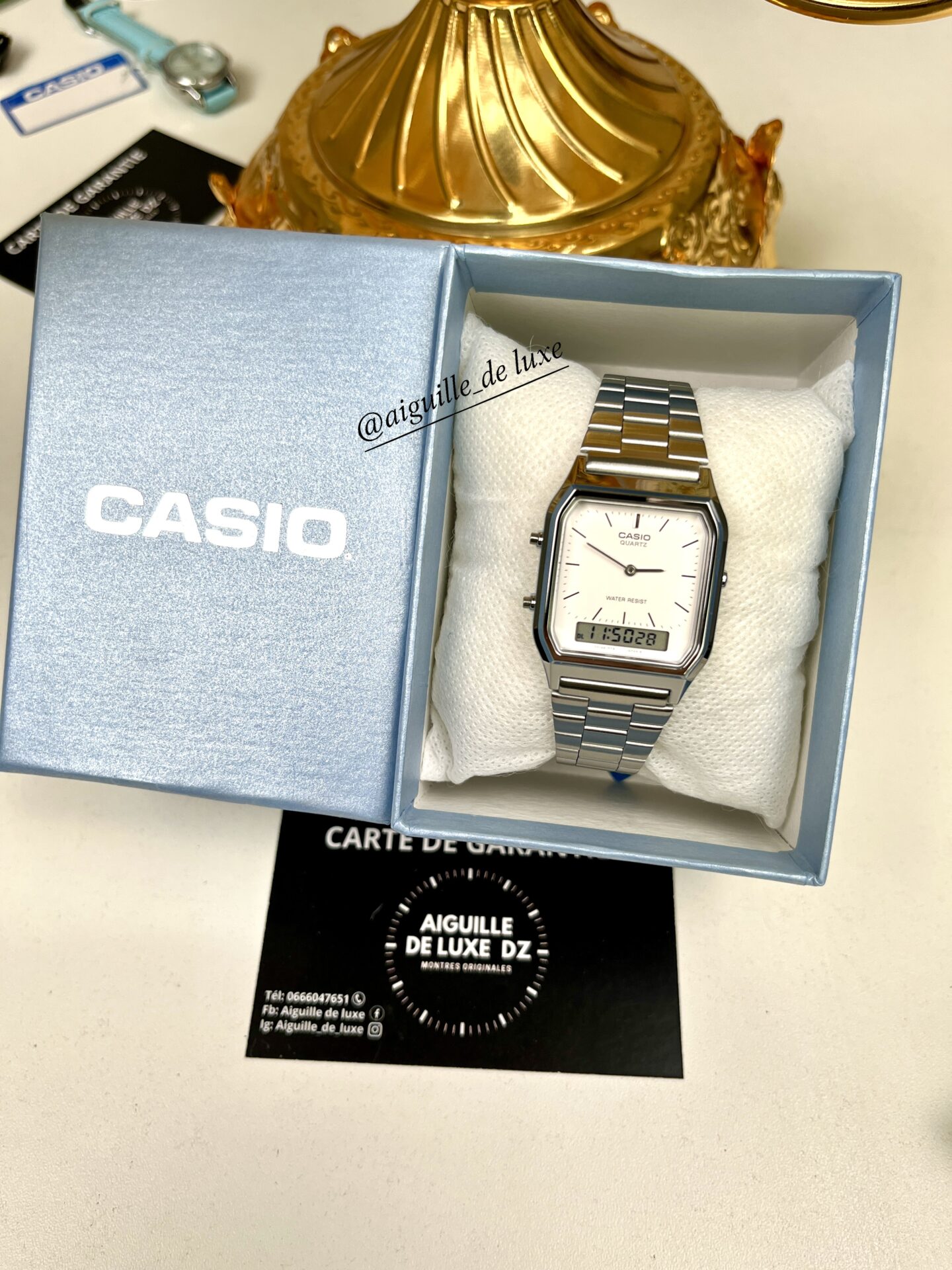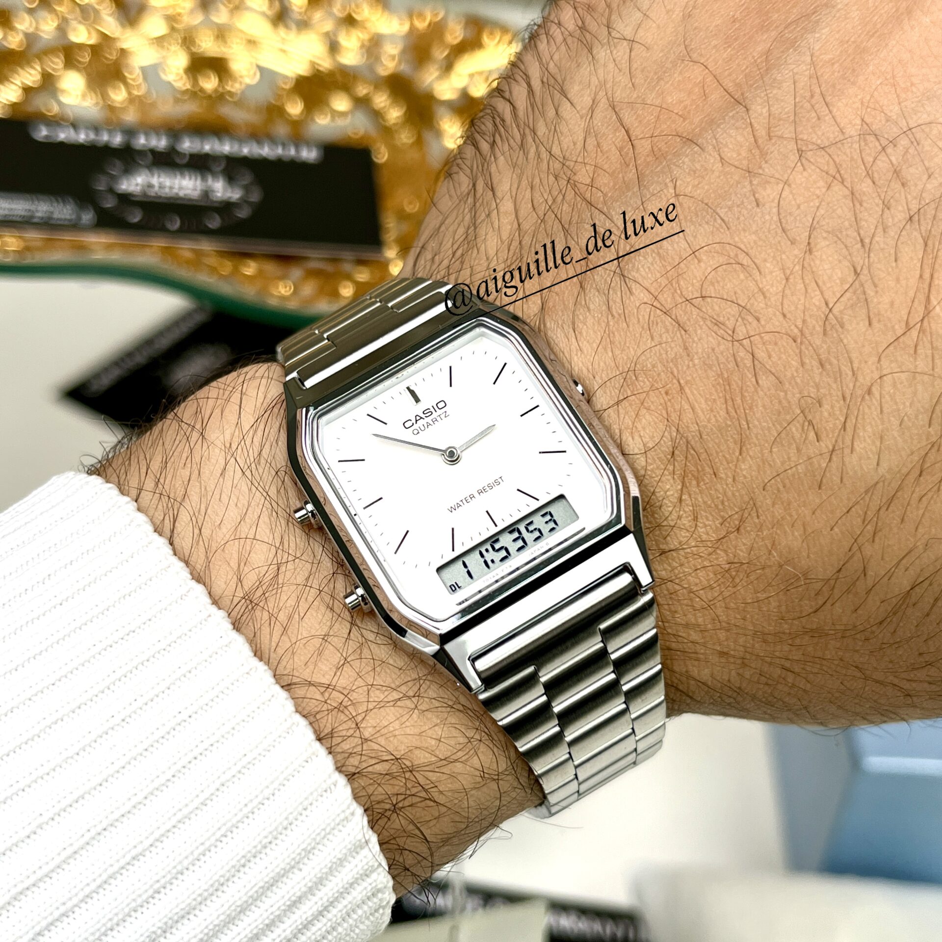 La Casio AQ-230A-7D s’impose par son équilibre réussi entre design raffiné et multifonctionnalité. Son boîtier relativement compact assure un port confortable, tandis que l’alliance du cadran analogique et de l’écran digital lui donne une vraie valeur ajoutée fonctionnelle : affichage de l’heure via aiguilles couplé au jour, date, chronométrage, alarme et double fuseau horaire.