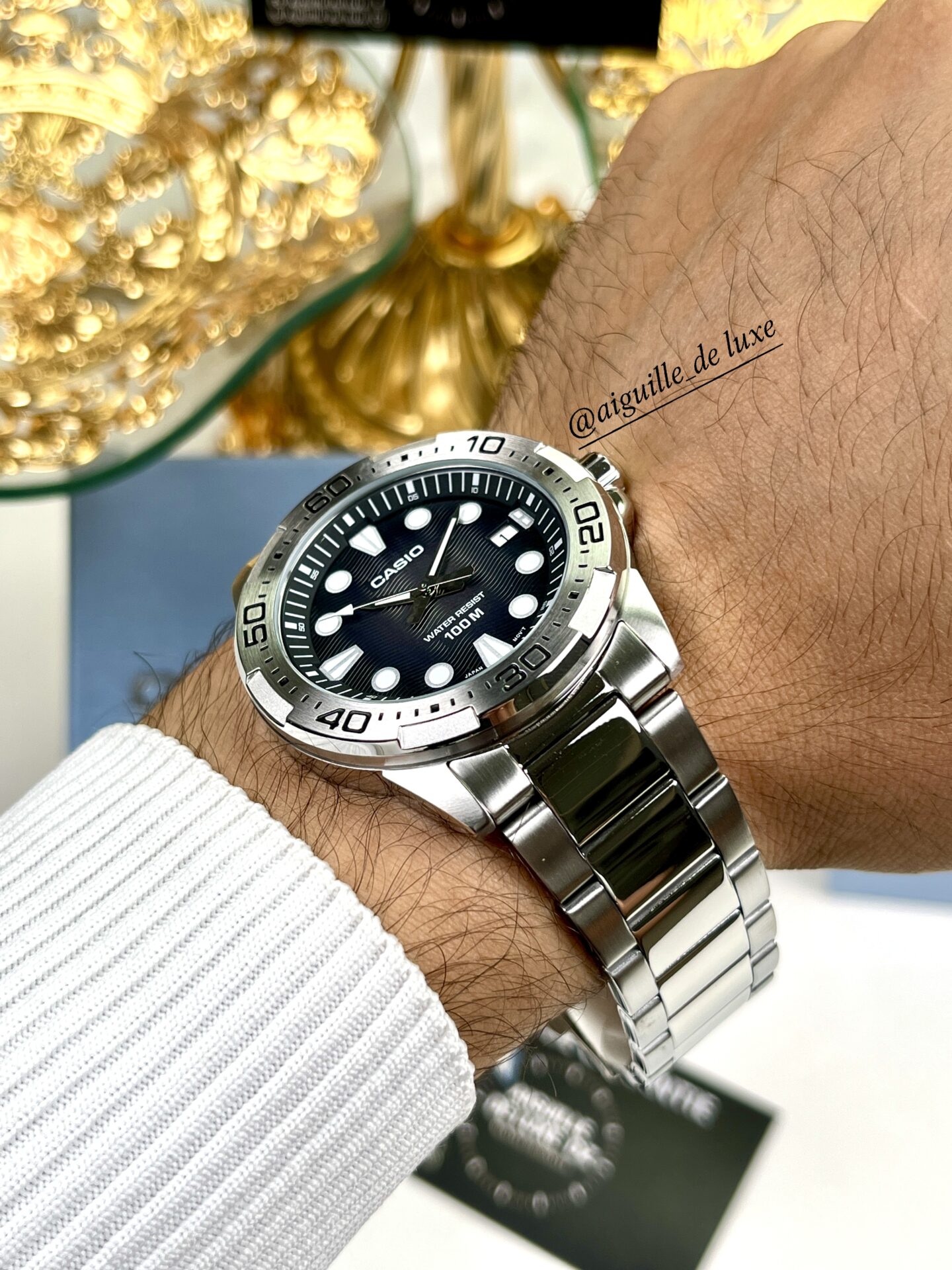 La Casio MTD-140D-1A séduit par son design sobre et raffiné, parfait pour un usage quotidien comme pour les occasions plus habillées. Son boîtier en acier inoxydable poli s’accorde à un cadran noir élégant, agrémenté d’index et d’aiguilles argentées offrant une visibilité optimale. La lunette unidirectionnelle apporte une touche sportive à l’ensemble, tout en renforçant son caractère fonctionnel.