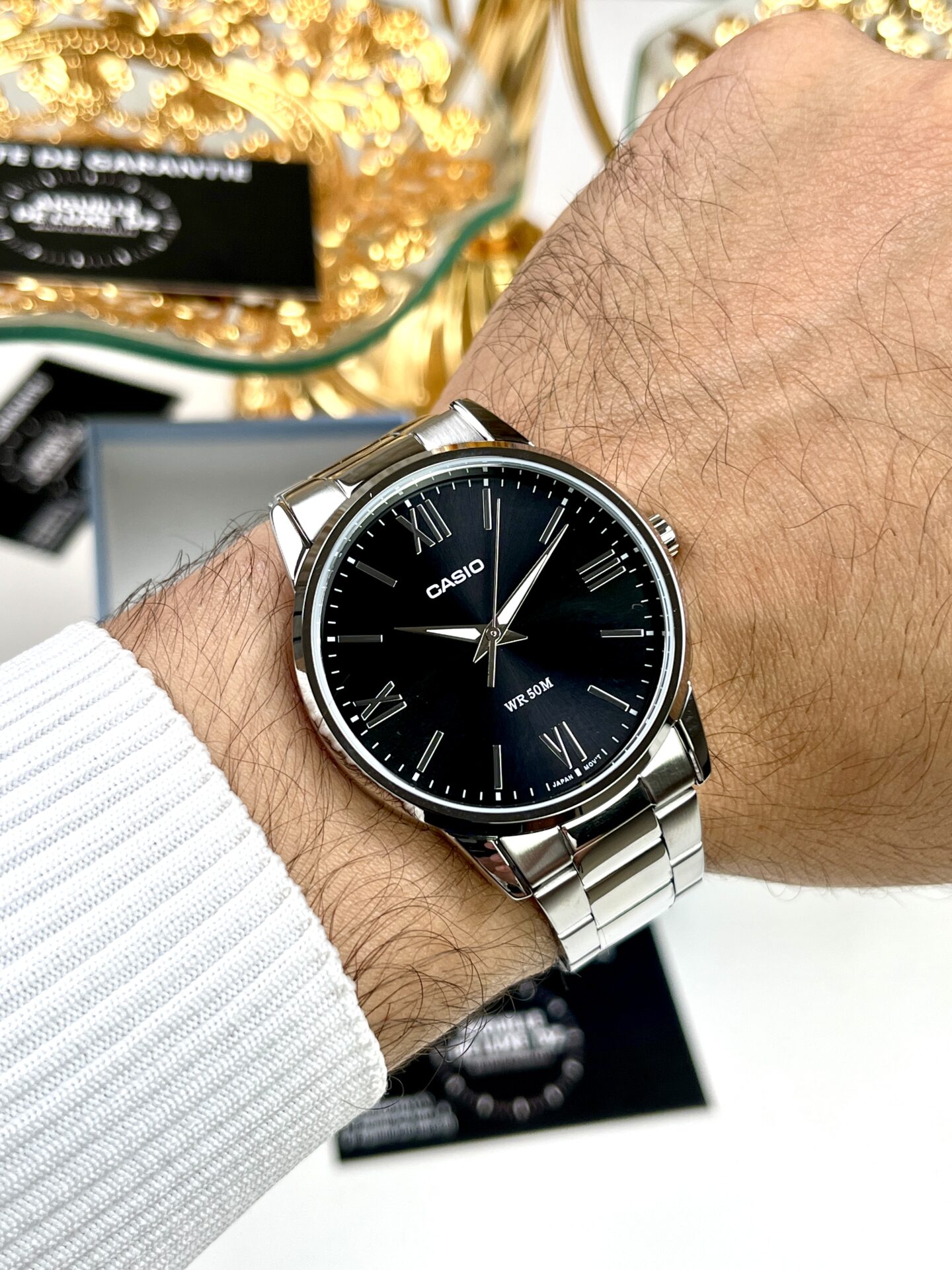 La Casio MTP‑1303DD‑1A s’inscrit dans la tradition des montres classiques de Casio, avec un cadran analogique sobre et un design qui mise sur la lisibilité et la polyvalence. Animée par un mouvement quartz fiable, elle propose une lecture fluide de l’heure grâce à ses trois aiguilles principales.