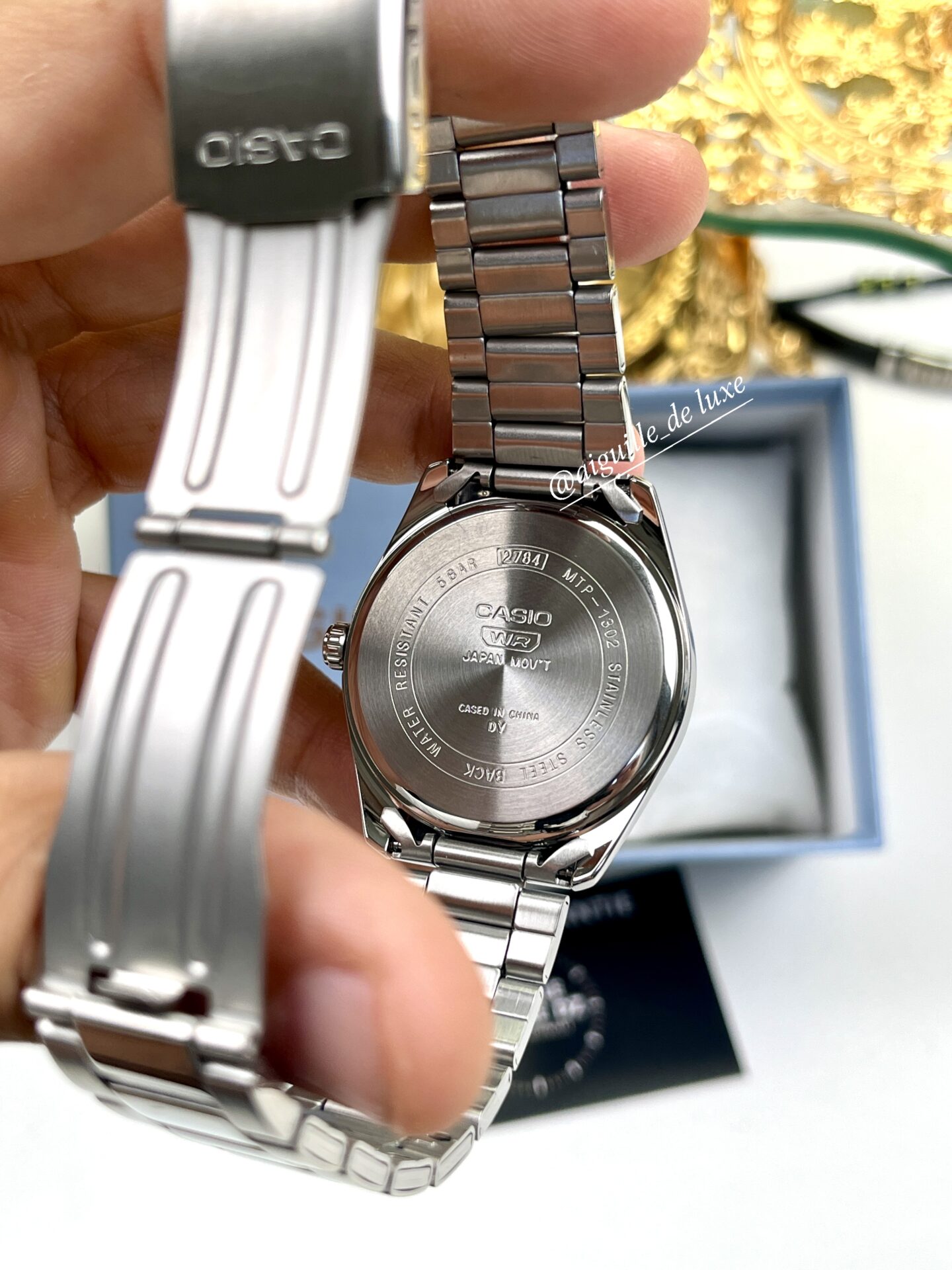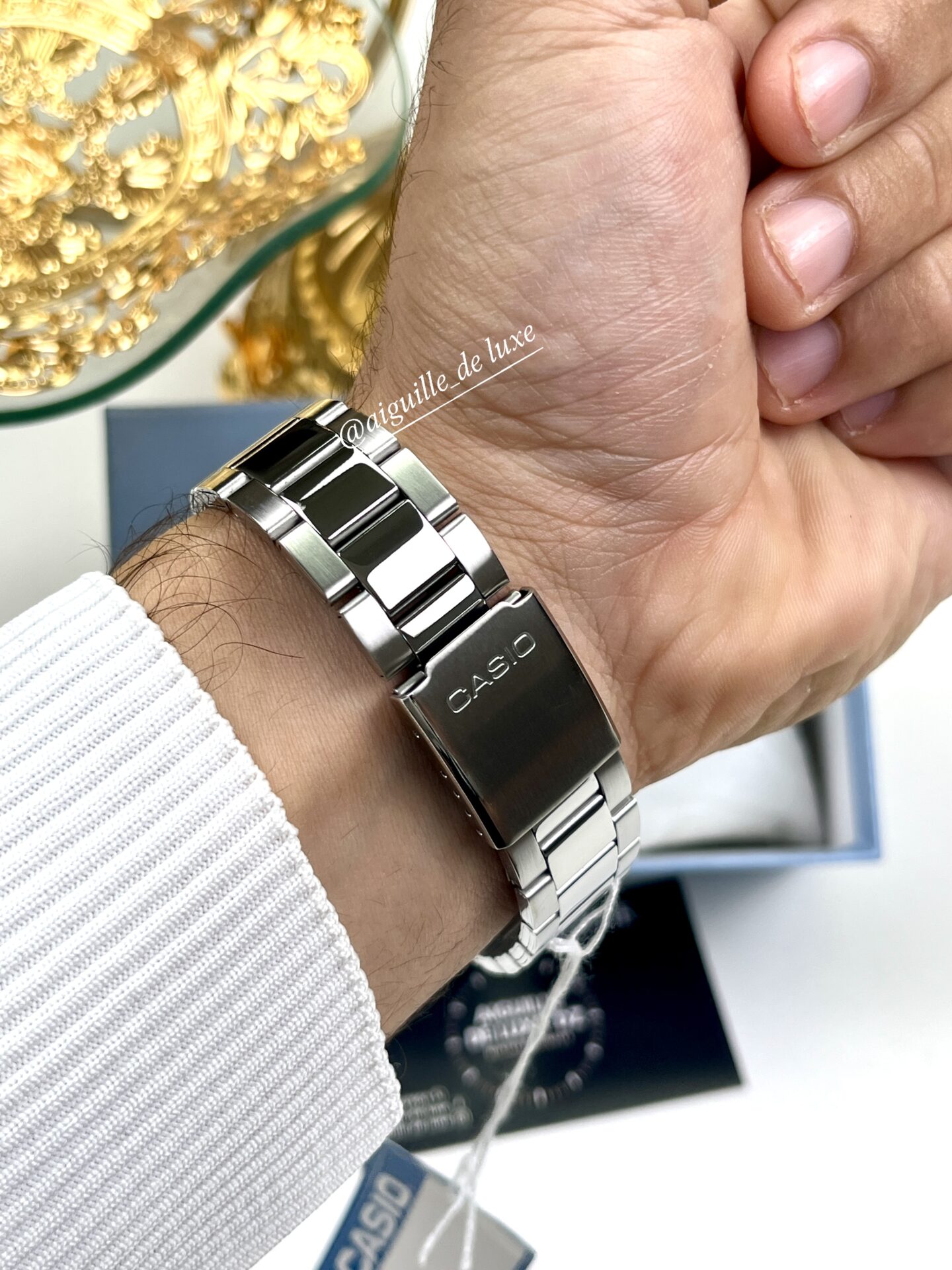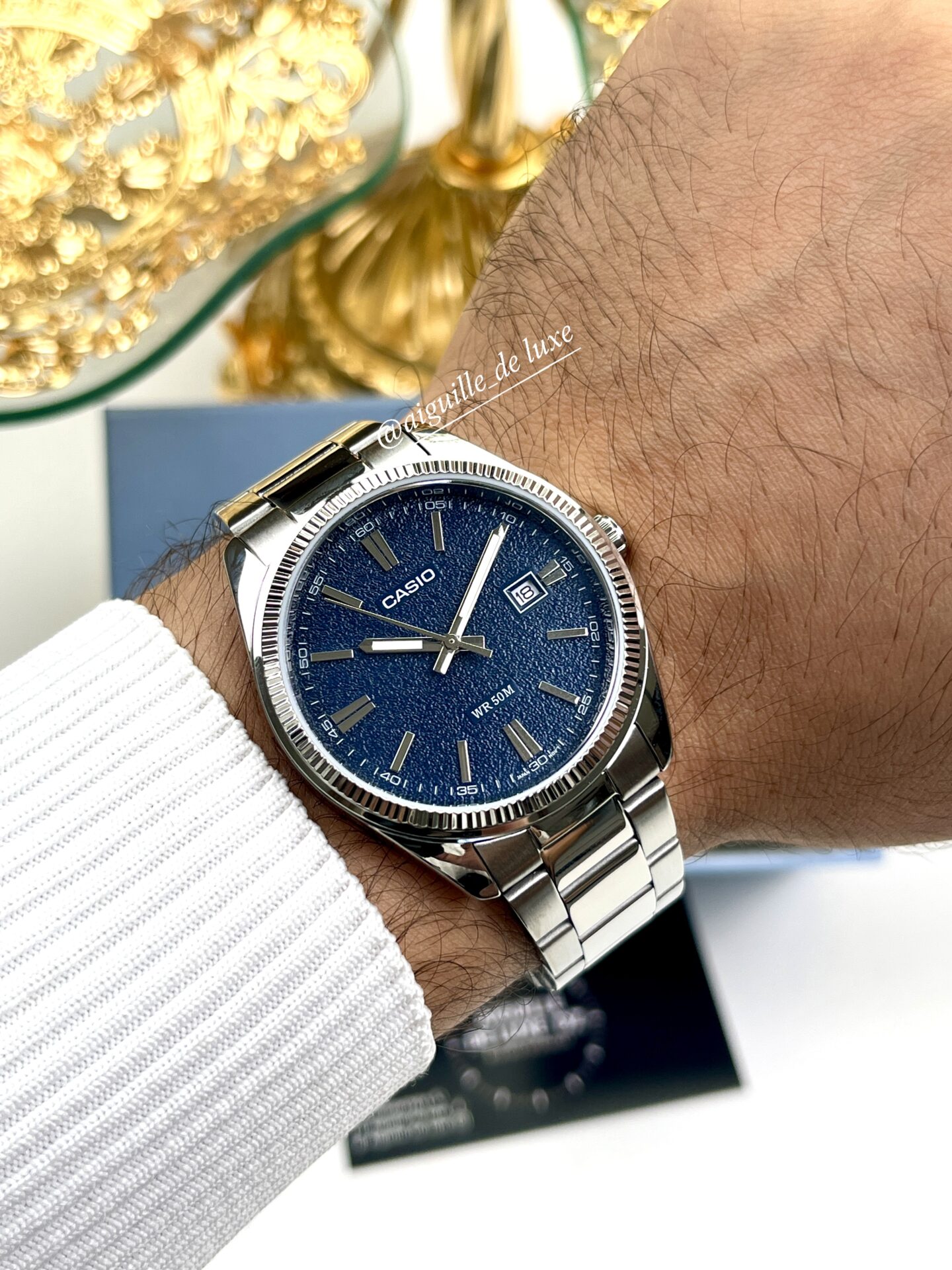 La Casio MTP-1302DA-2A1 séduit par son élégance intemporelle et sa conception soignée. Son cadran bleu profond, rehaussé d’index argentés et d’un guichet date à trois heures, évoque un style classique et raffiné. Le boîtier et le bracelet en acier inoxydable lui confèrent une allure distinguée tout en assurant robustesse et durabilité.
