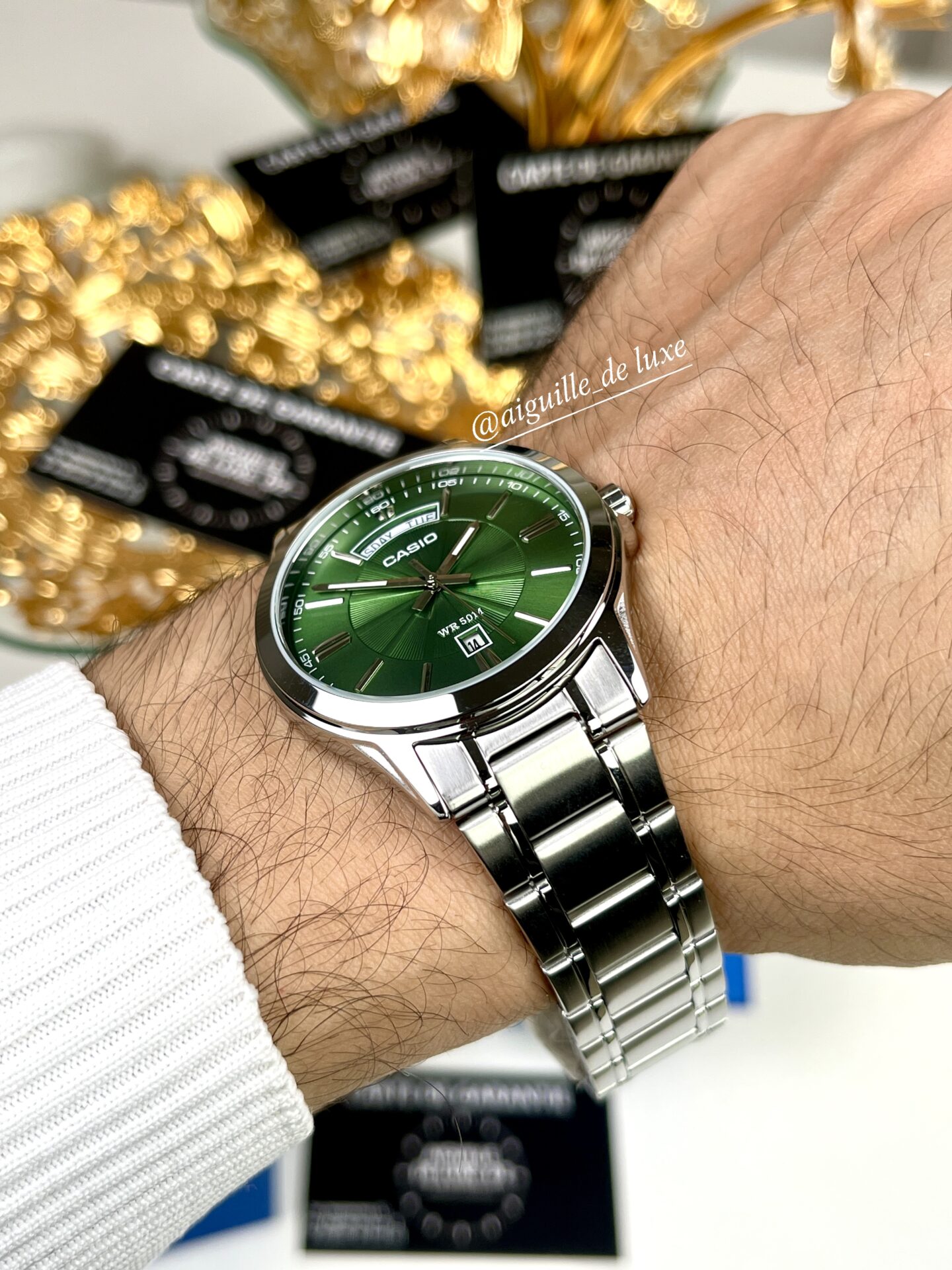 La Casio MTP‑1381D‑3A est une montre analogique conçue pour ceux qui apprécient un style classique avec une touche moderne. Son cadran vert profond offre une excellente lisibilité, agrémenté d’index distincts et de trois aiguilles pour les heures, minutes et secondes. Le double affichage jour et date renforce sa fonctionnalité au quotidien.