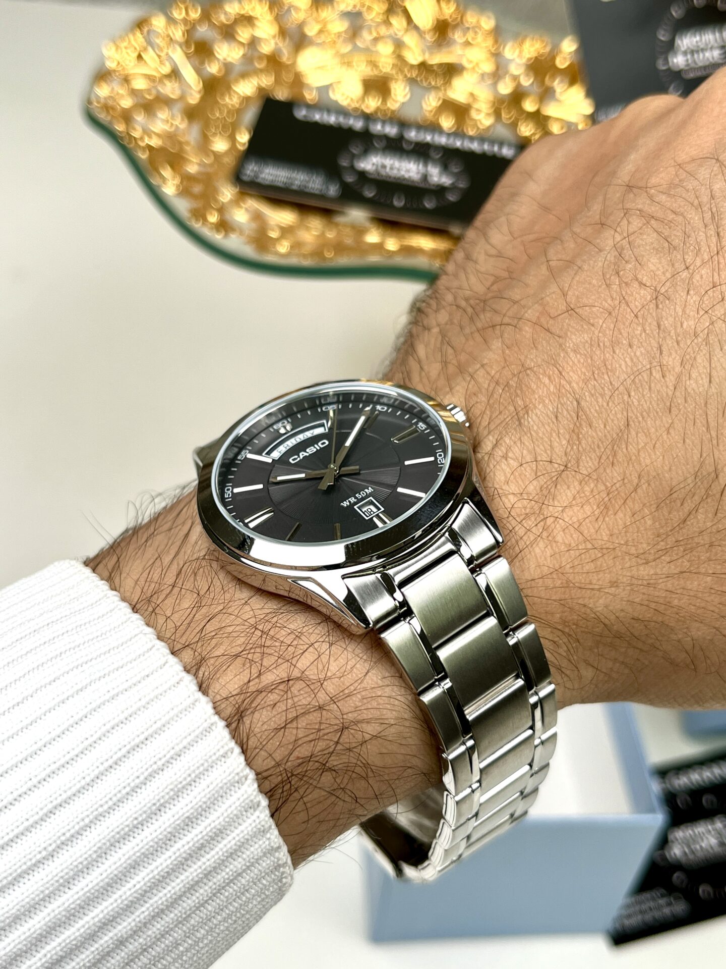 Le boîtier et le bracelet en acier inoxydable offrent une sensation de solidité et un confort durable au poignet. La finition métallique confère à la montre une allure raffinée tout en garantissant une bonne résistance à l’usure. La boucle déployante assure un maintien sécurisé et une manipulation simple.