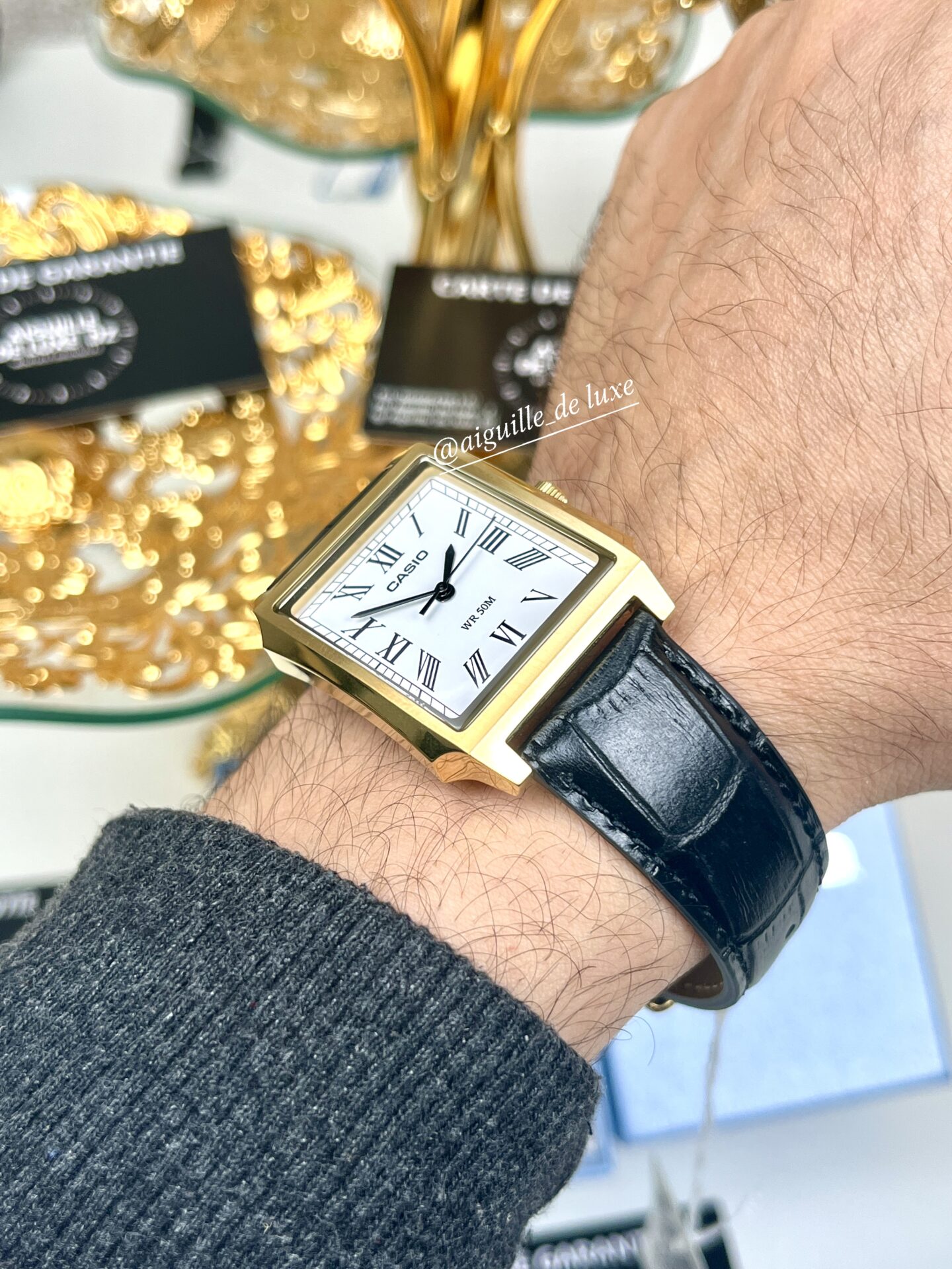 La Casio MTP-B190GL-7B se distingue par son design rectangulaire raffiné, inspiré des montres classiques dites “tank”, offrant une élégance intemporelle. Son cadran clair, souvent agrémenté de chiffres romains et d’aiguilles fines, renforce son style habillé et assure une excellente lisibilité au quotidien.