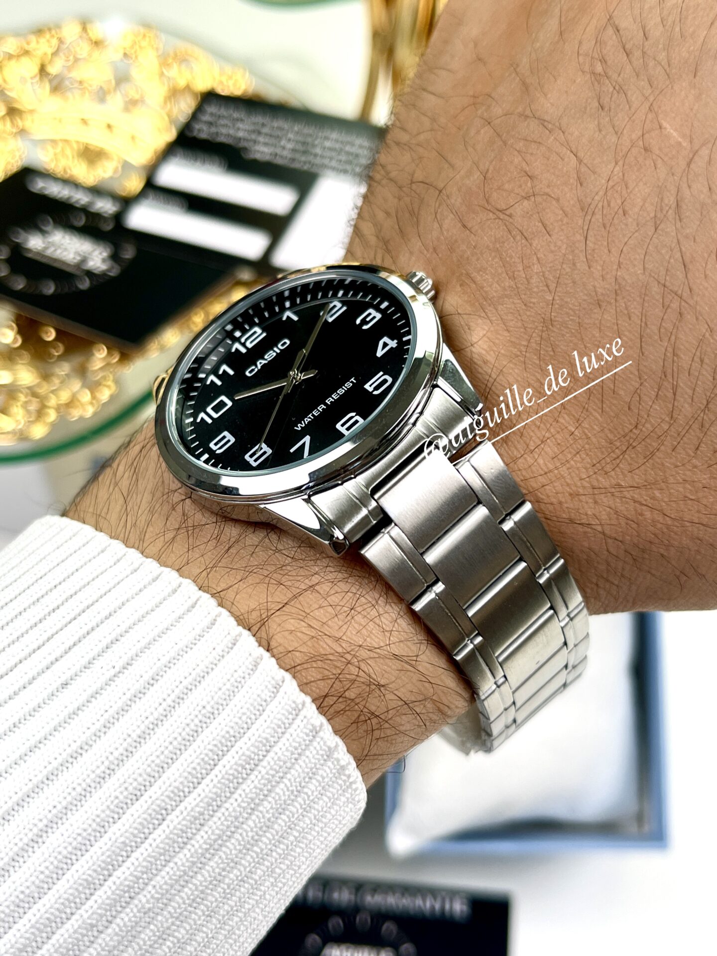 Avec son cadran rond noir raffiné et son bracelet en acier inoxydable, la Casio MTP-V001D-1B incarne la sobriété et la robustesse. Légère et confortable, elle s’adapte aussi bien aux journées de travail qu’aux moments de détente.