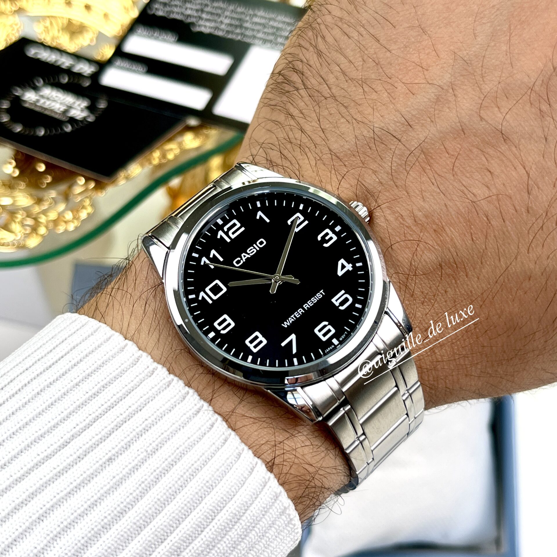 La Casio MTP-V001D-1B est une montre au design intemporel qui mise sur la simplicité et l’élégance. Son cadran rond noir met en valeur des index clairs et bien contrastés, offrant une excellente lisibilité. Le boîtier en métal et le bracelet en acier inoxydable garantissent solidité et longévité, tout en apportant une touche de sophistication.