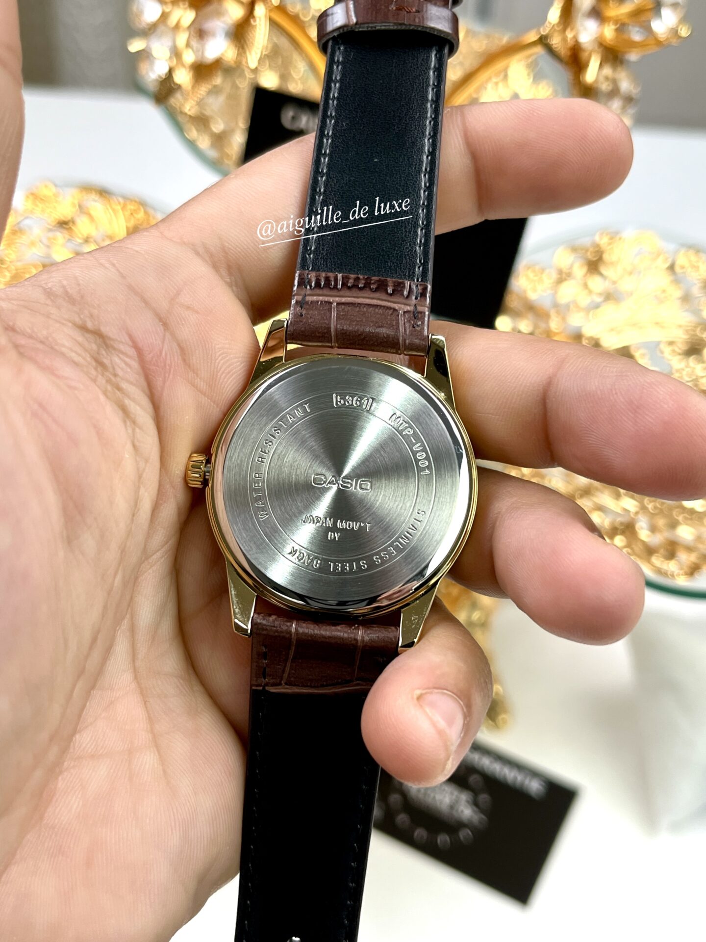 La Casio MTP-V001GL-9B se caractérise par une finition élégante et un design soigné. Le boîtier compact de 45 × 38 mm et 8 mm d’épaisseur lui confère une présence affirmée sans être imposante. Le traitement doré du boîtier apporte une touche de prestige, tandis que le cadran clair et épuré garantit une lecture immédiate de l’heure.