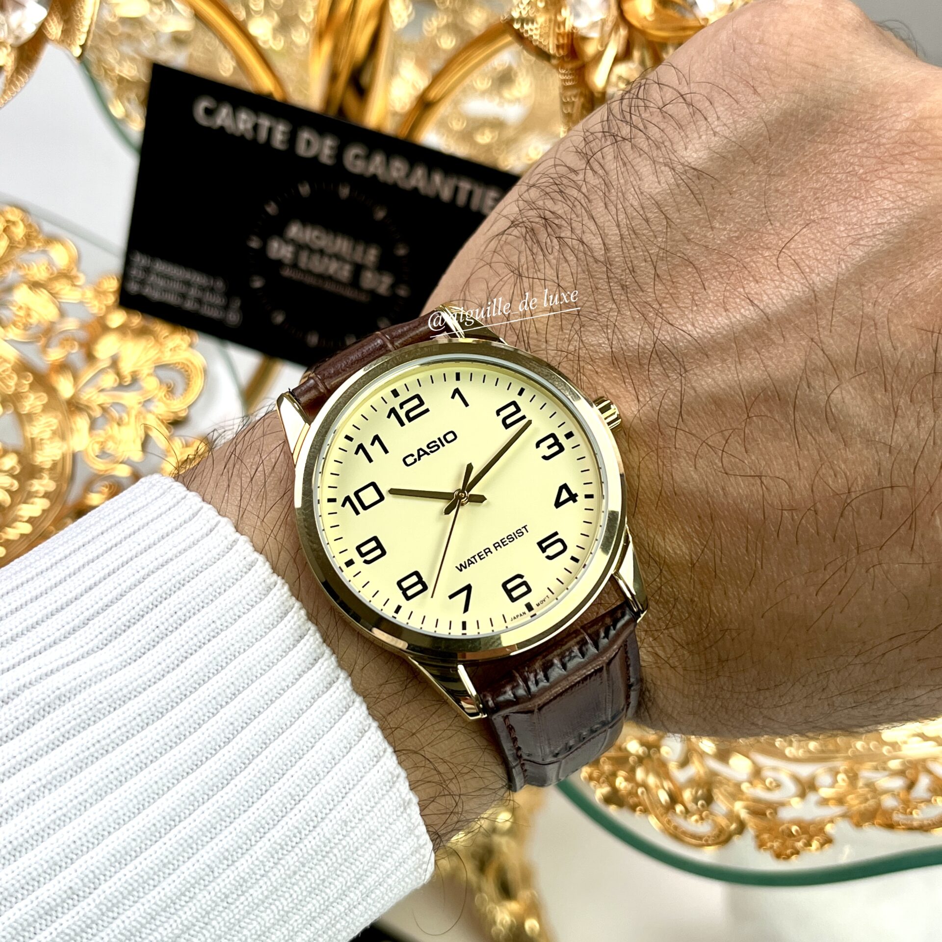 Casio Homme MTP-V001GL-9B Montre Élégante Dorée Cuir Brun