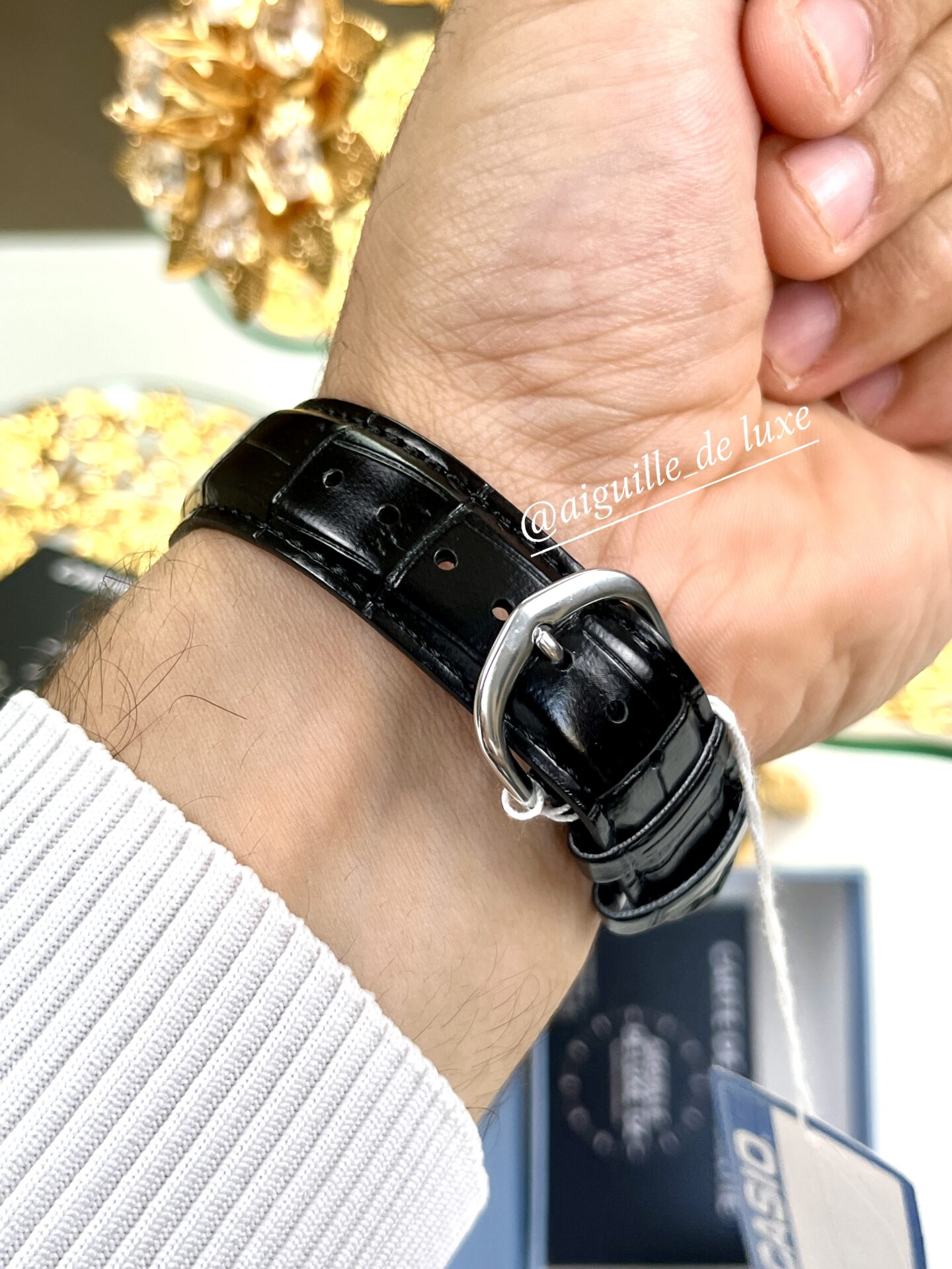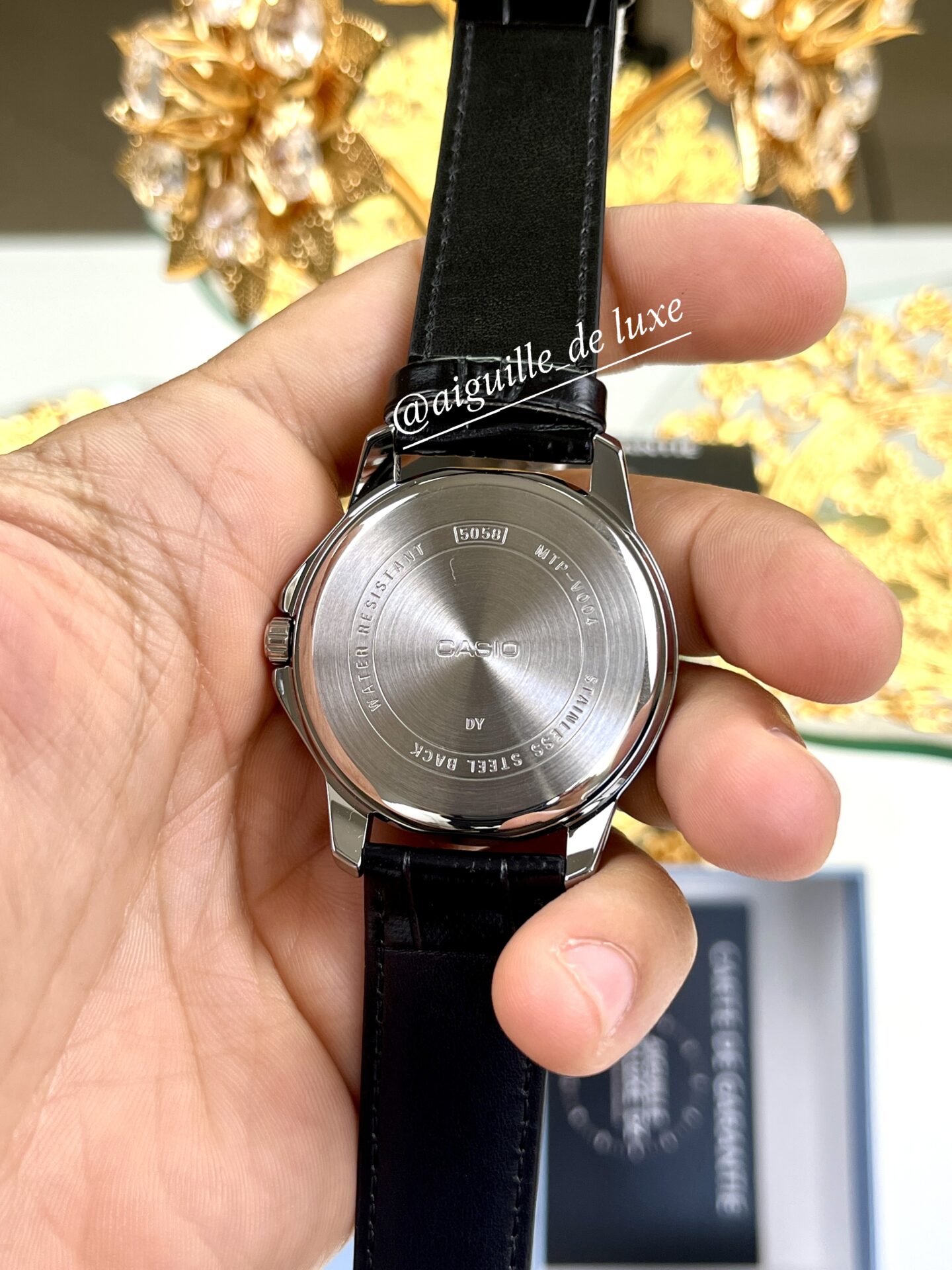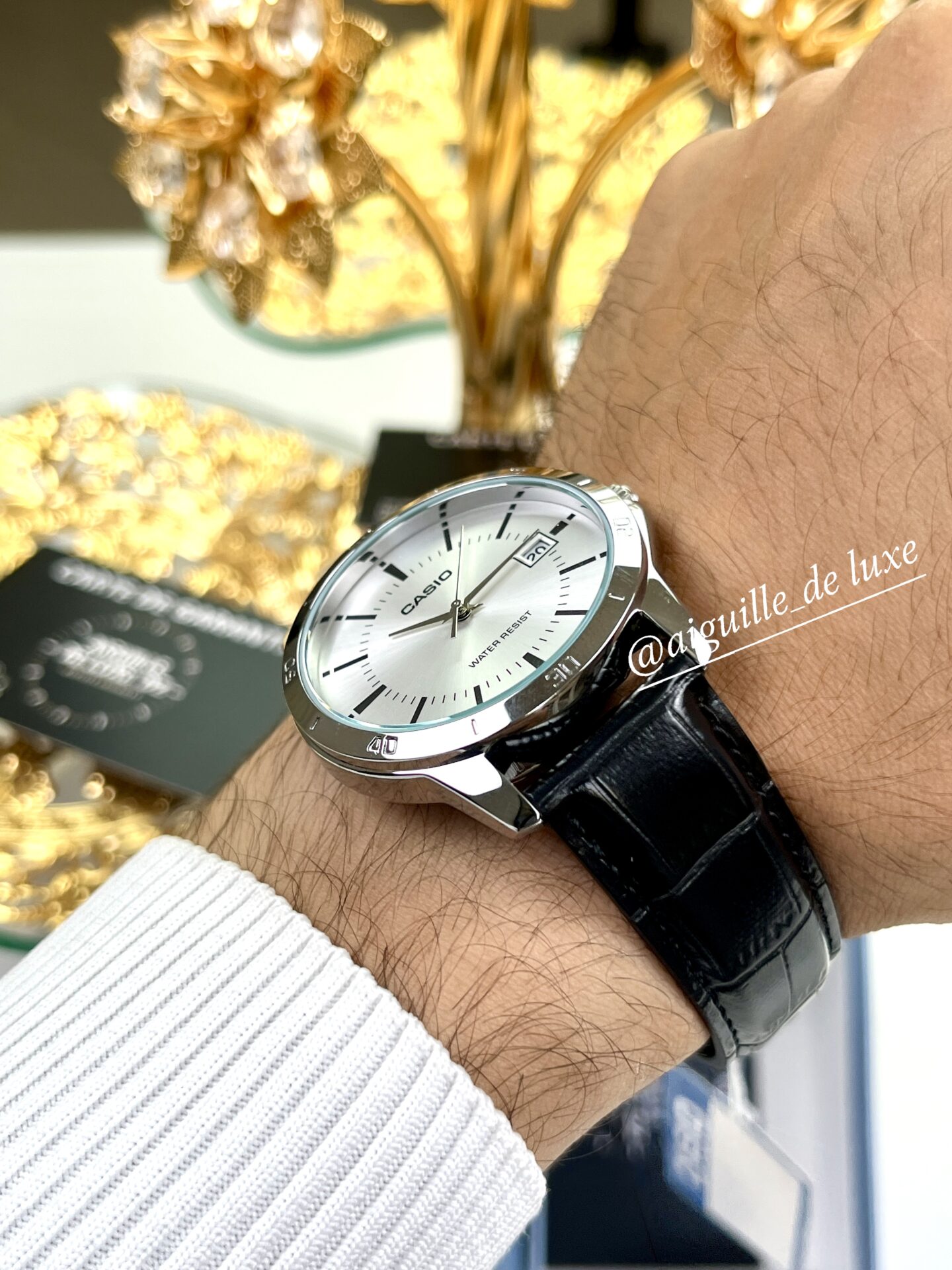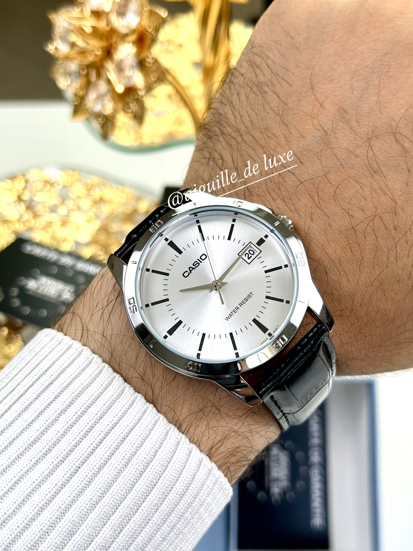 La Casio MTP-V004L-7A se distingue par son design sobre et élégant, alliant modernité et tradition. Son cadran rond argenté, agrémenté d’index simples et d’un guichet date discret, offre une lisibilité claire et un style raffiné. Le boîtier en acier inoxydable présente une finition argentée soignée qui apporte de la durabilité sans ostentation, tandis que le bracelet en cuir véritable noir garantit confort et tenue élégante.