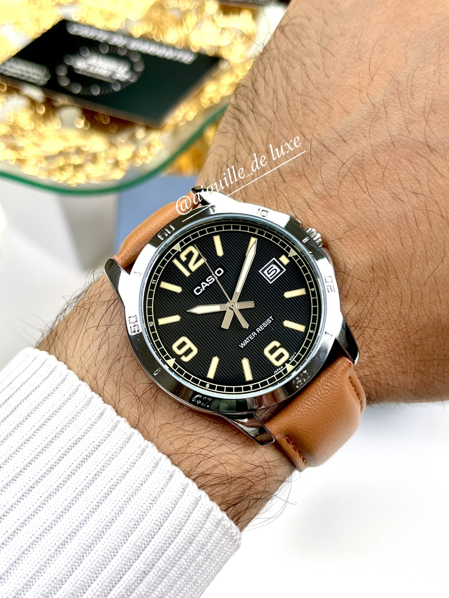 La Casio MTP-V004L-1B2 se distingue par son design raffiné et polyvalent. Son cadran rond noir profond est accentué par des index et des aiguilles argentées, offrant un contraste élégant pour une lecture facile. Le boîtier en acier inoxydable avec finition argent donne solidité et durabilité, tandis que le bracelet en cuir véritable marron assure confort et caractère.