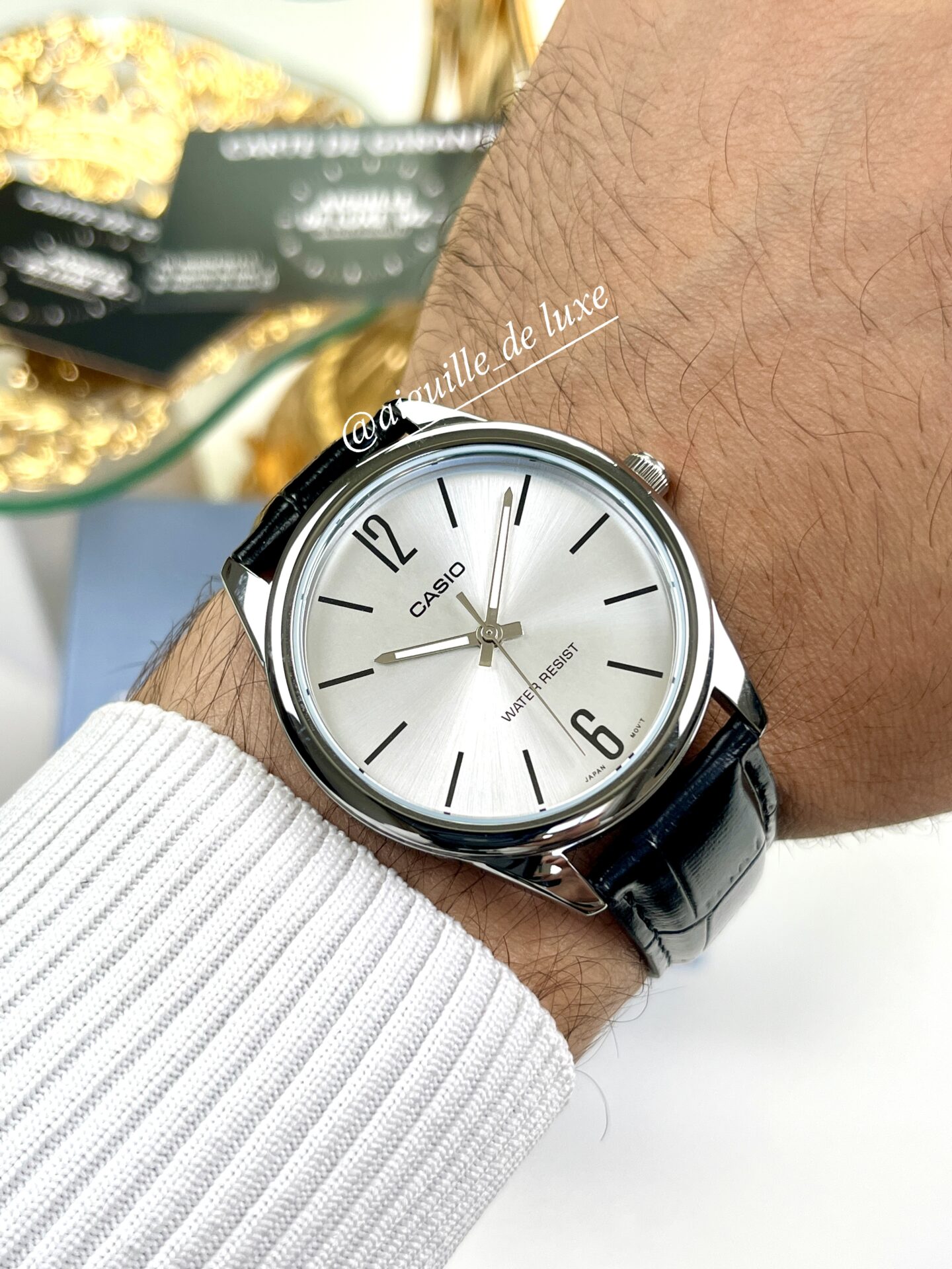 Avec son cadran rond argenté lumineux et son bracelet en cuir véritable noir, la Casio MTP-V005L-7B allie sobriété, élégance et robustesse. Fine et confortable, elle s’intègre naturellement au quotidien comme aux occasions habillées.