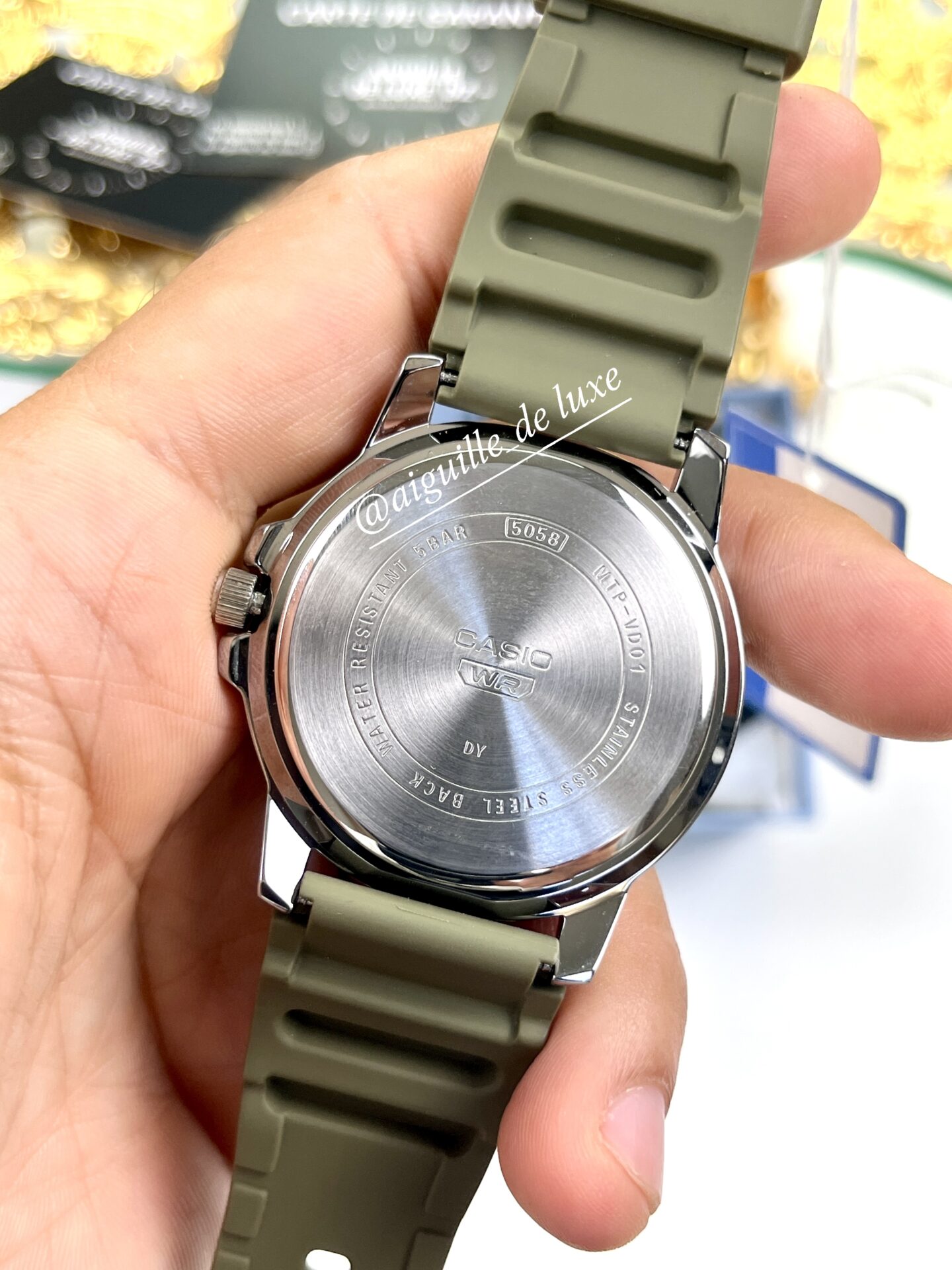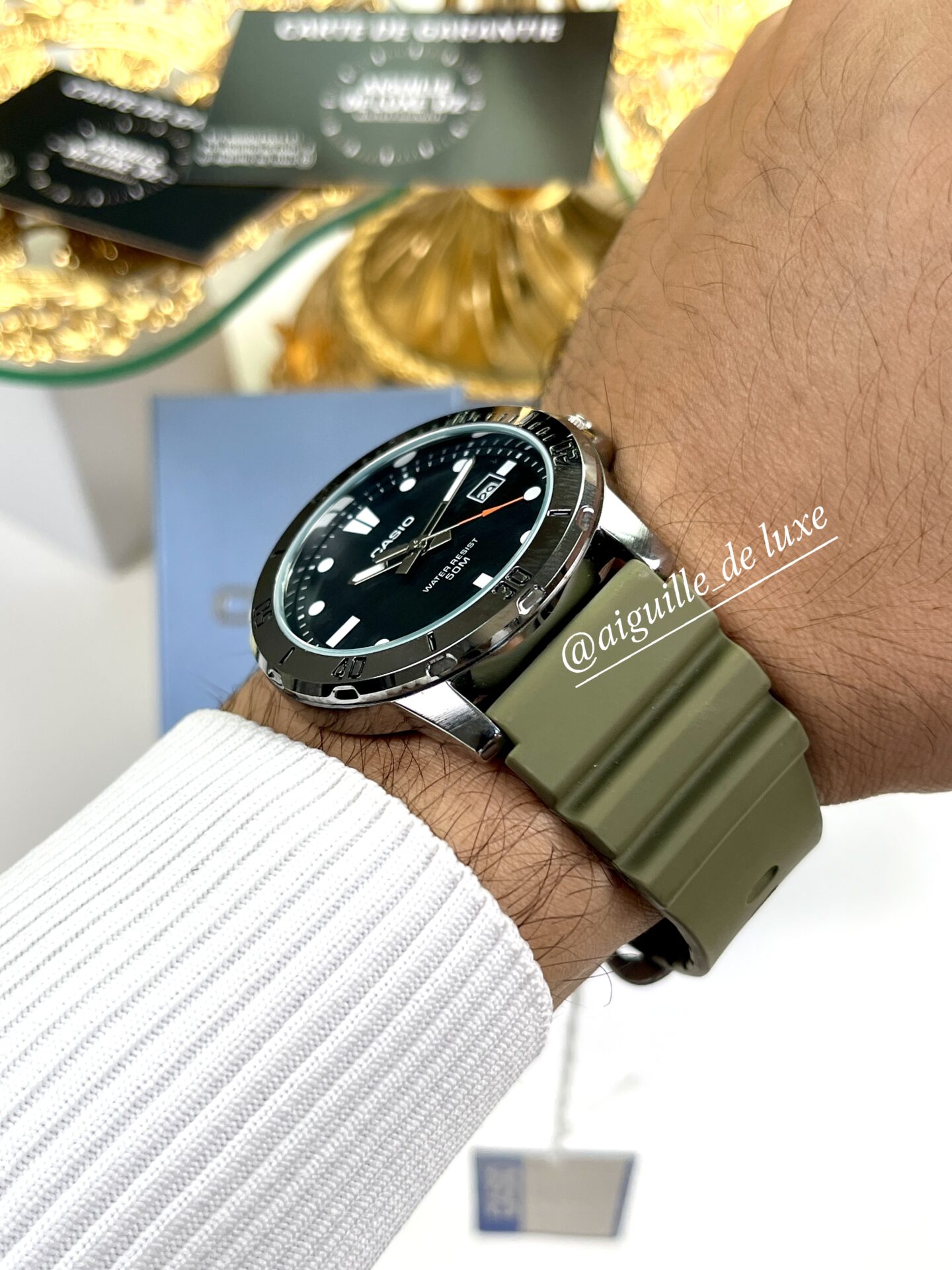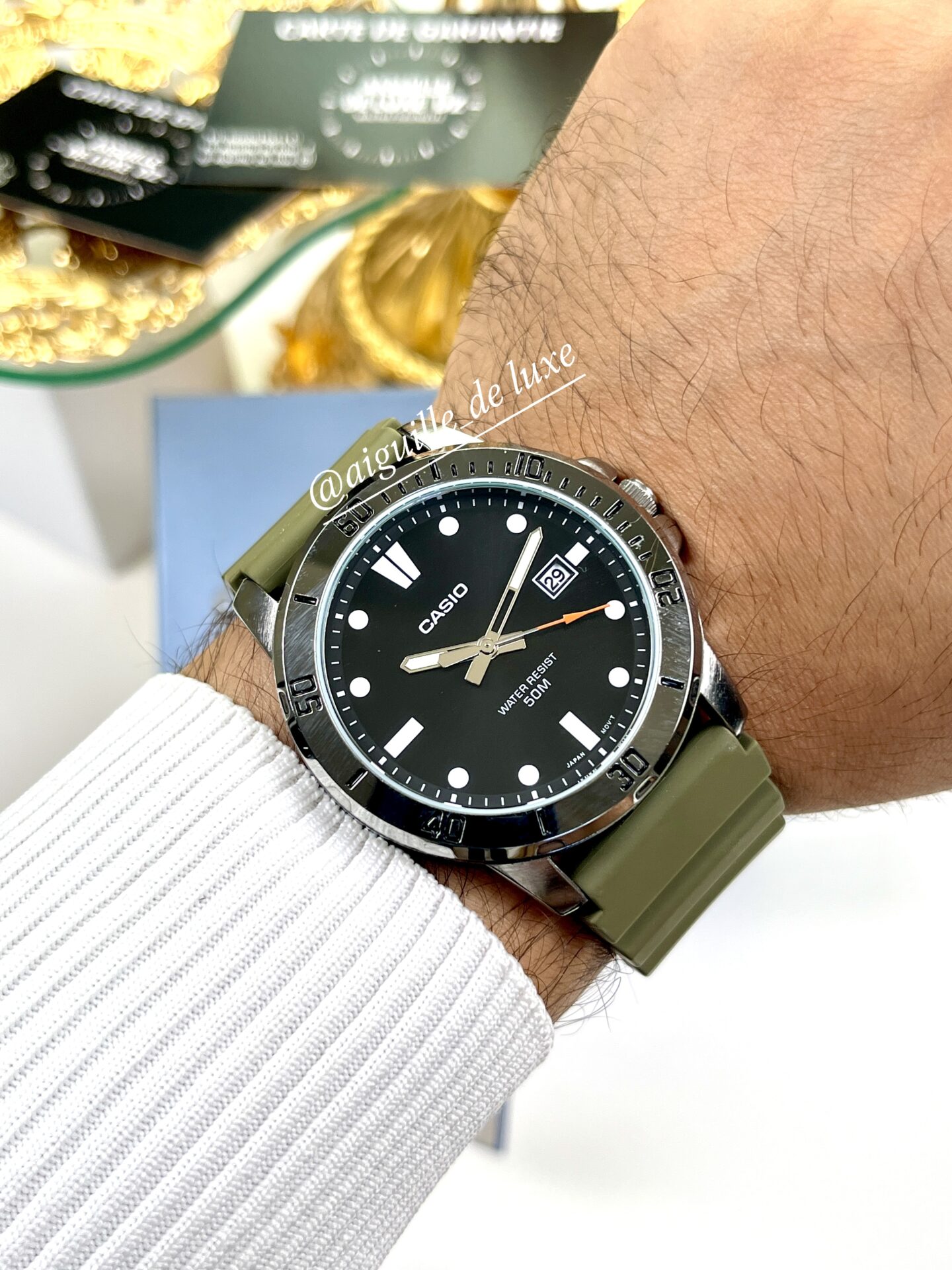 Avec son cadran rond noir contrasté et son bracelet résine vert, la Casio MTP-VD01-3E affiche un esprit sportif tout en conservant une élégance discrète. Solide et confortable, elle accompagne vos activités de tous les jours avec fiabilité.
