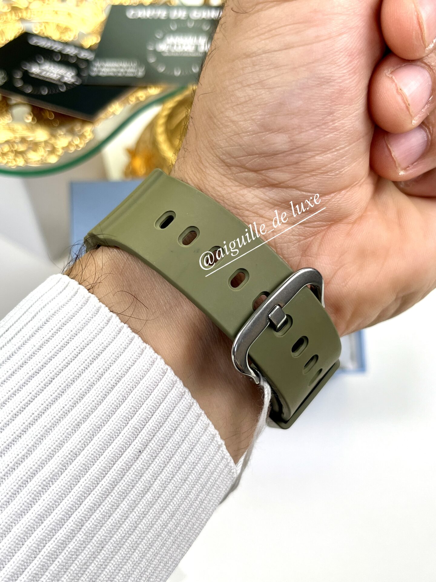 Équipé d’un mouvement quartz analogique, ce modèle garantit une précision fiable de ± 20 secondes par mois. Avec des dimensions de 49 × 45 × 10,3 mm, il présente une présence marquée au poignet sans être trop imposant. Le poids de 79 g contribue à un bon équilibre entre robustesse et confort.