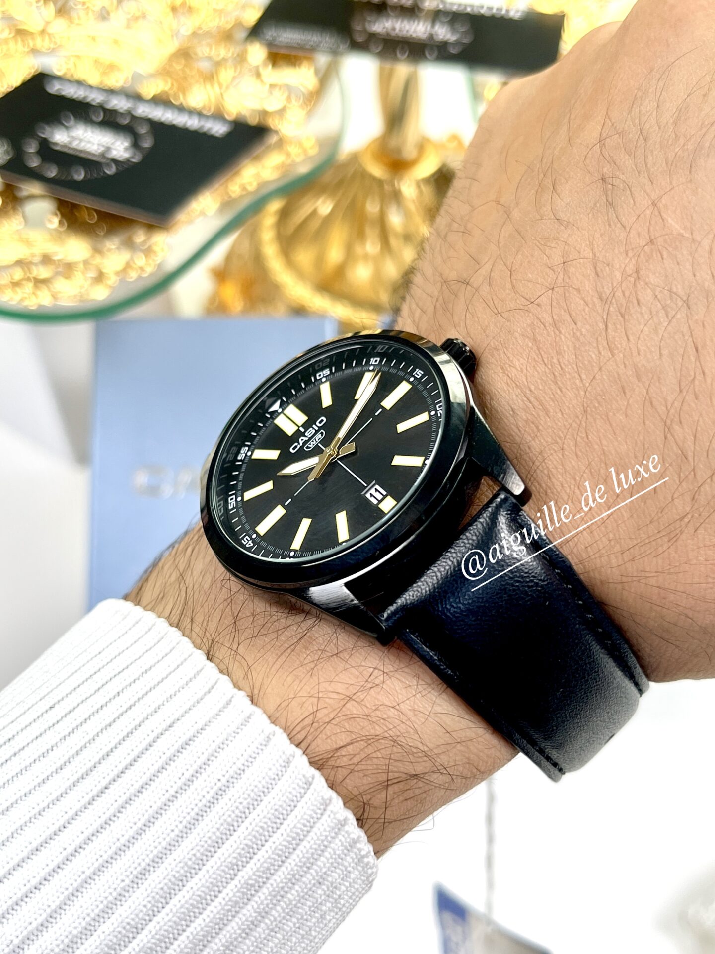 La Casio MTP-VD02BL-1E séduit par son allure moderne et raffinée. Son cadran rond noir, rehaussé d’index clairs et d’un guichet date, offre une lisibilité parfaite et une élégance sobre. Le boîtier en acier inoxydable allie solidité et finesse, tandis que le bracelet en cuir véritable noir garantit confort et style intemporel.