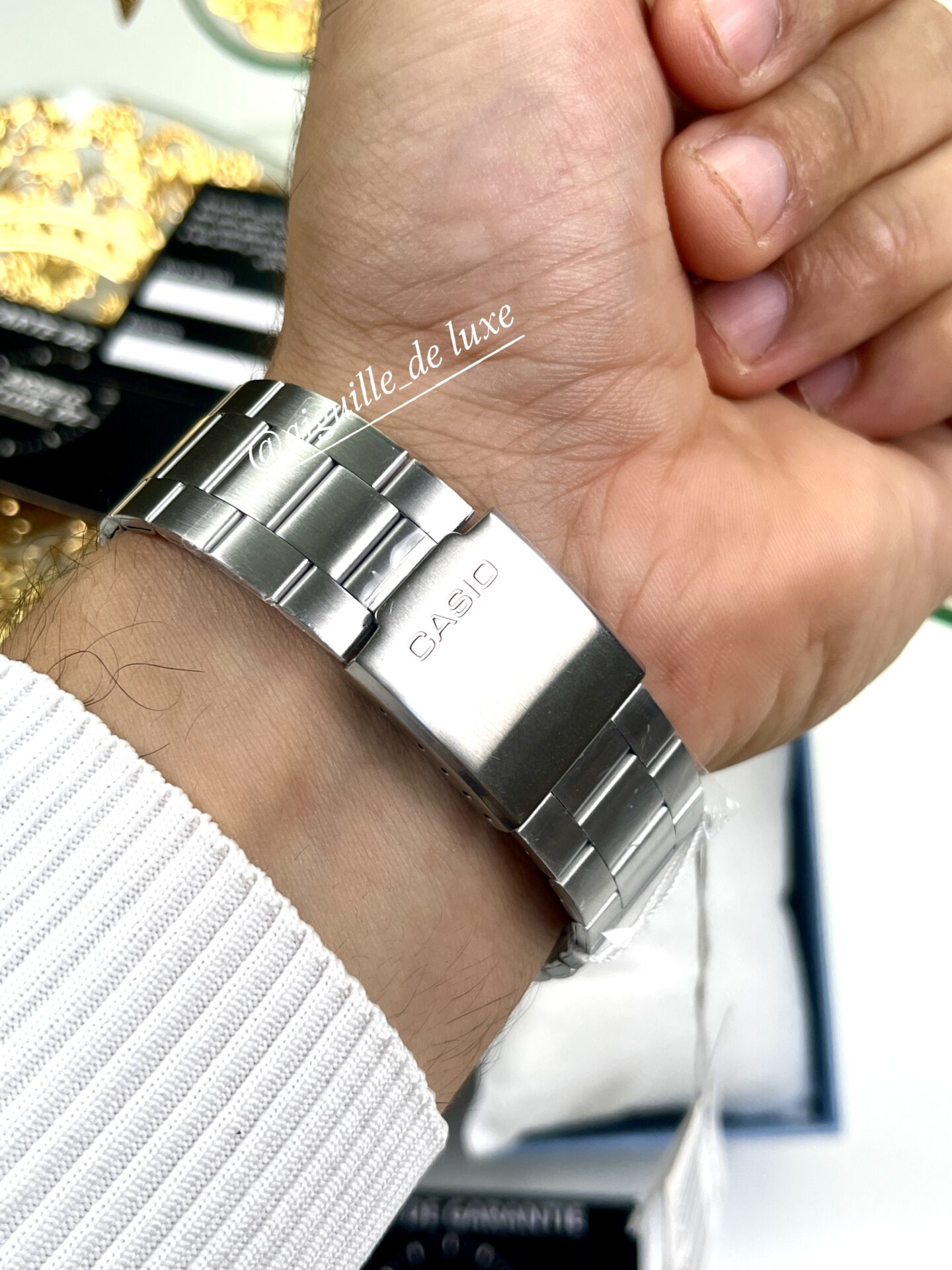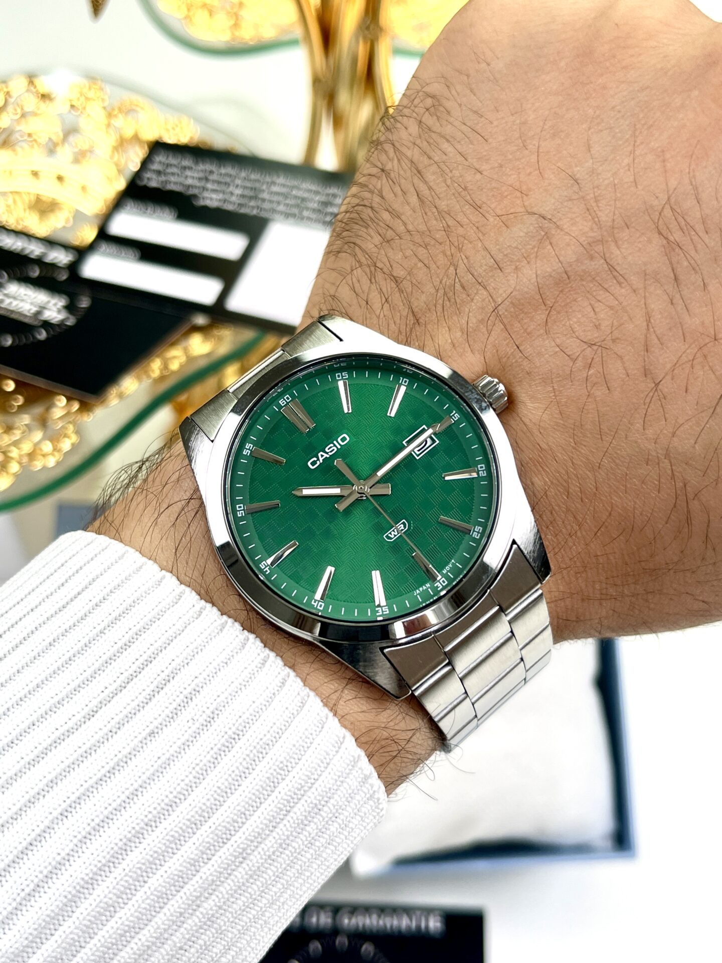La Casio MTP-VD03D-3A incarne le style raffiné et la qualité de fabrication qui font la réputation de la marque japonaise. Son cadran vert profond, lumineux et original, apporte une touche de caractère tout en restant élégant et facile à assortir. Les index argentés et les aiguilles contrastées offrent une excellente lisibilité, tandis que le guichet date discret à 3 heures renforce son aspect fonctionnel.