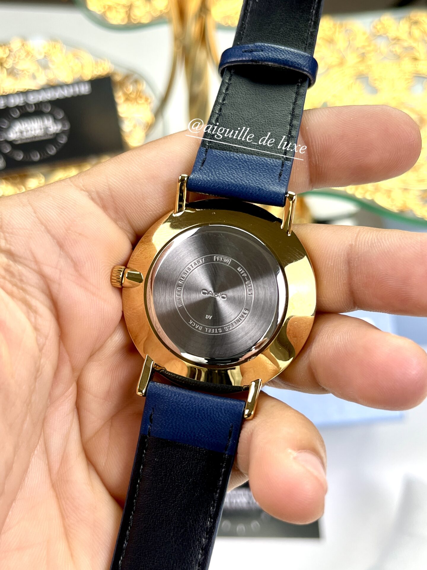 La Casio MTP-VT01GL-2B séduit par son cadran bleu profond subtilement contrasté avec un boîtier ton or rose. Avec ses lignes simples, son bracelet en cuir et sa lecture claire, elle allie sophistication discrète et efficacité.