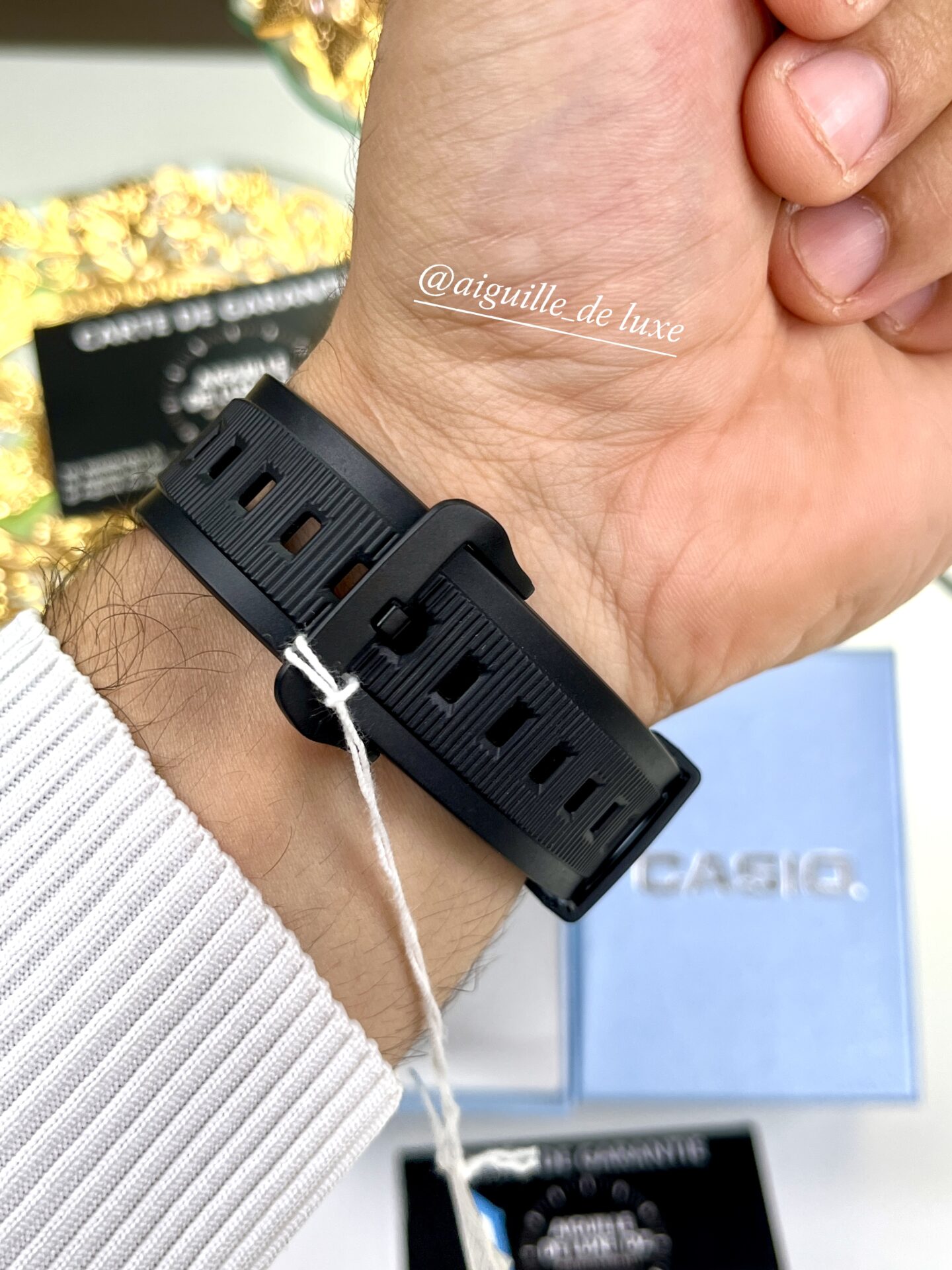 Avec un boîtier de 51,2 × 50,6 × 15 mm, la montre affiche une silhouette affirmée, renforcée par une lunette en métal sur un boîtier en résine qui allie légèreté et robustesse. Le bracelet en résine est durable, flexible et confortable sur le poignet, tandis que la boucle ardillon assure un maintien fiable. Pesant environ 60 g, elle reste agréable à porter au quotidien.