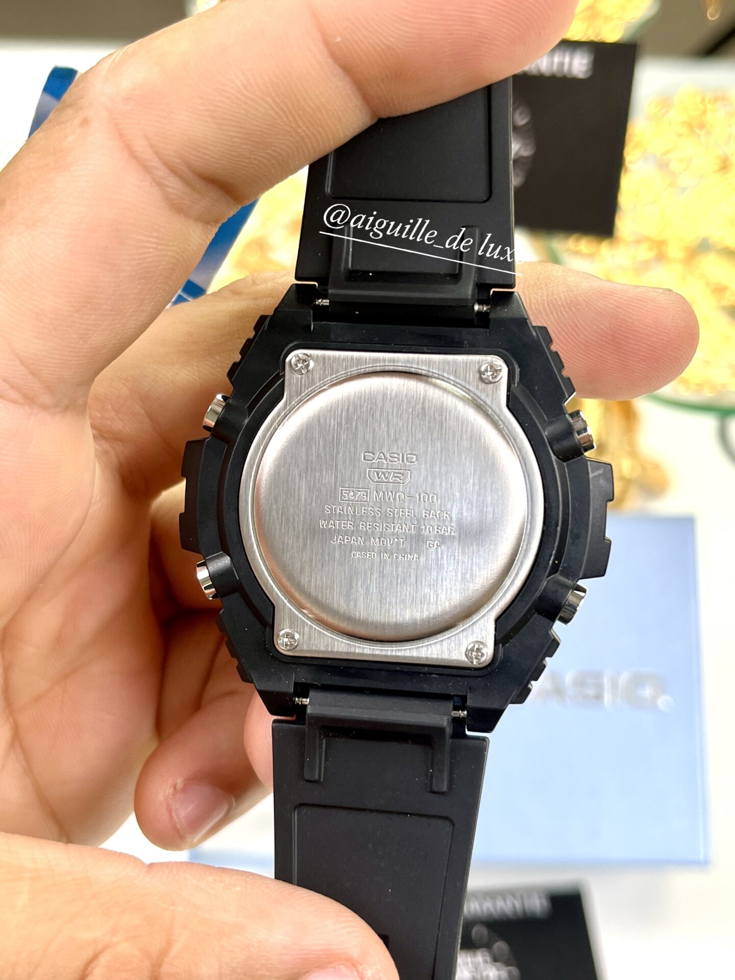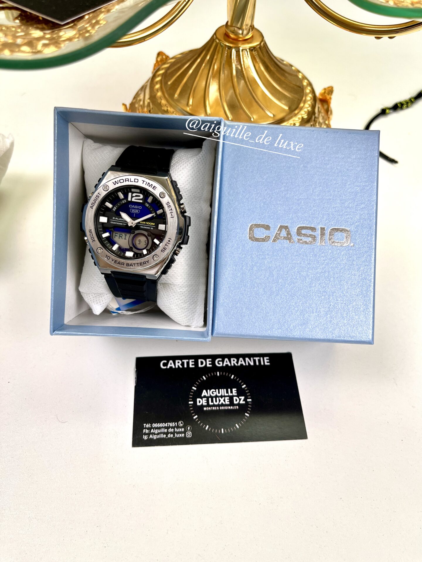 • Résistance à l’eau : 100 m (10 bar)La Casio MWQ-100-2A se démarque par son cadran bleu vibrant, rehaussé d’éléments métalliques et d’index contrastés pour une excellente lisibilité. Sa conception combine un affichage analogique classique avec un écran digital intégré, offrant des fonctions pratiques comme le chronomètre 1/100 s, le compte à rebours, l’heure mondiale (30 villes), 3 alarmes quotidiennes (avec répétition), un calendrier automatique et la mémoire téléphonique (jusqu’à 30 ensembles).