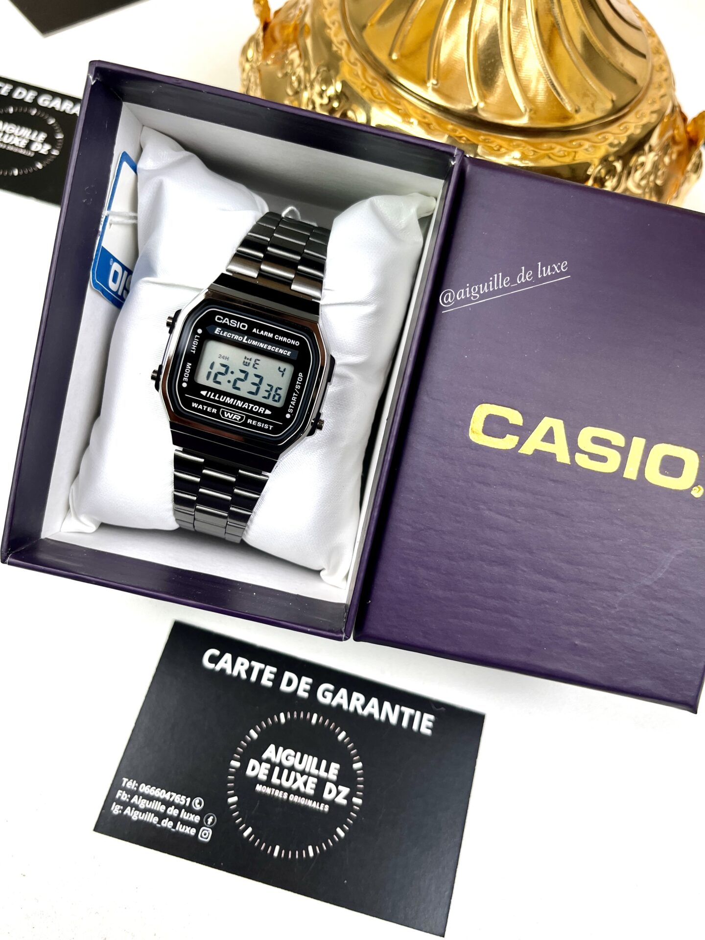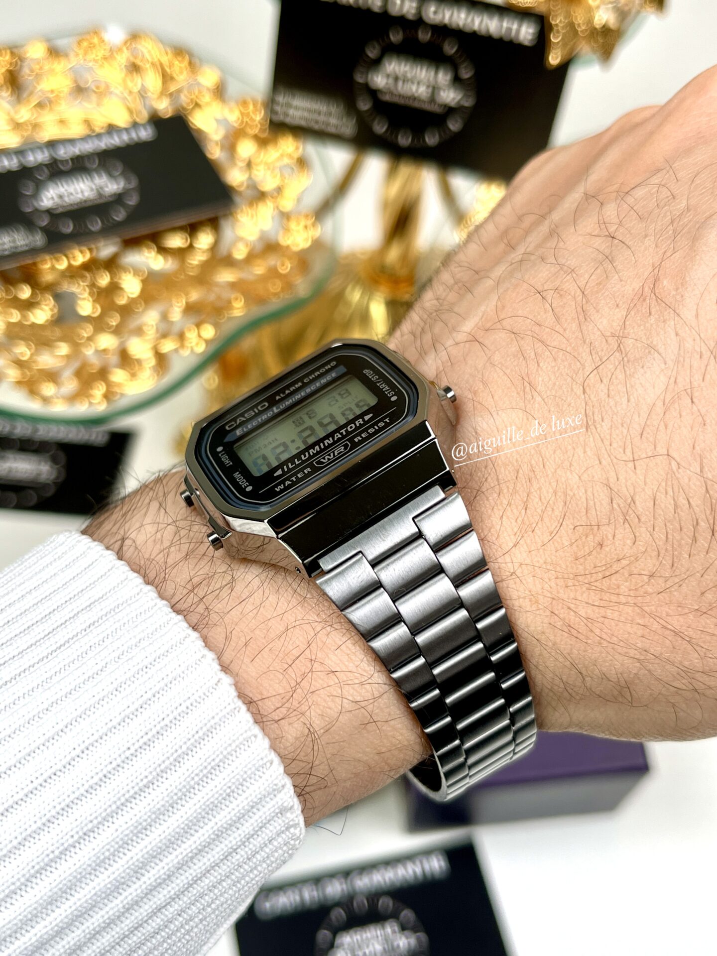 La Casio A168WGG-1A est une montre numérique unisexe au design vintage, dotée d’un boîtier et d’un bracelet en acier inoxydable noir, d’un rétroéclairage électroluminescent, d’un chronomètre précis et d’une résistance à l’eau adaptée à une utilisation quotidienne.