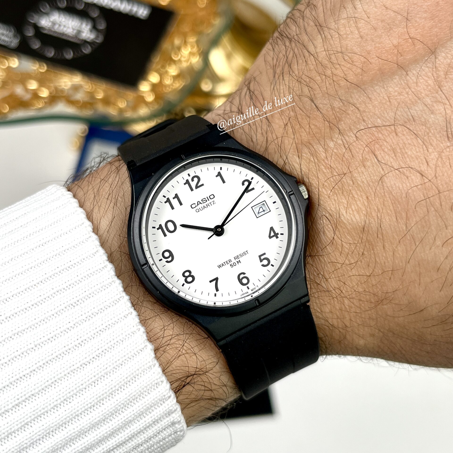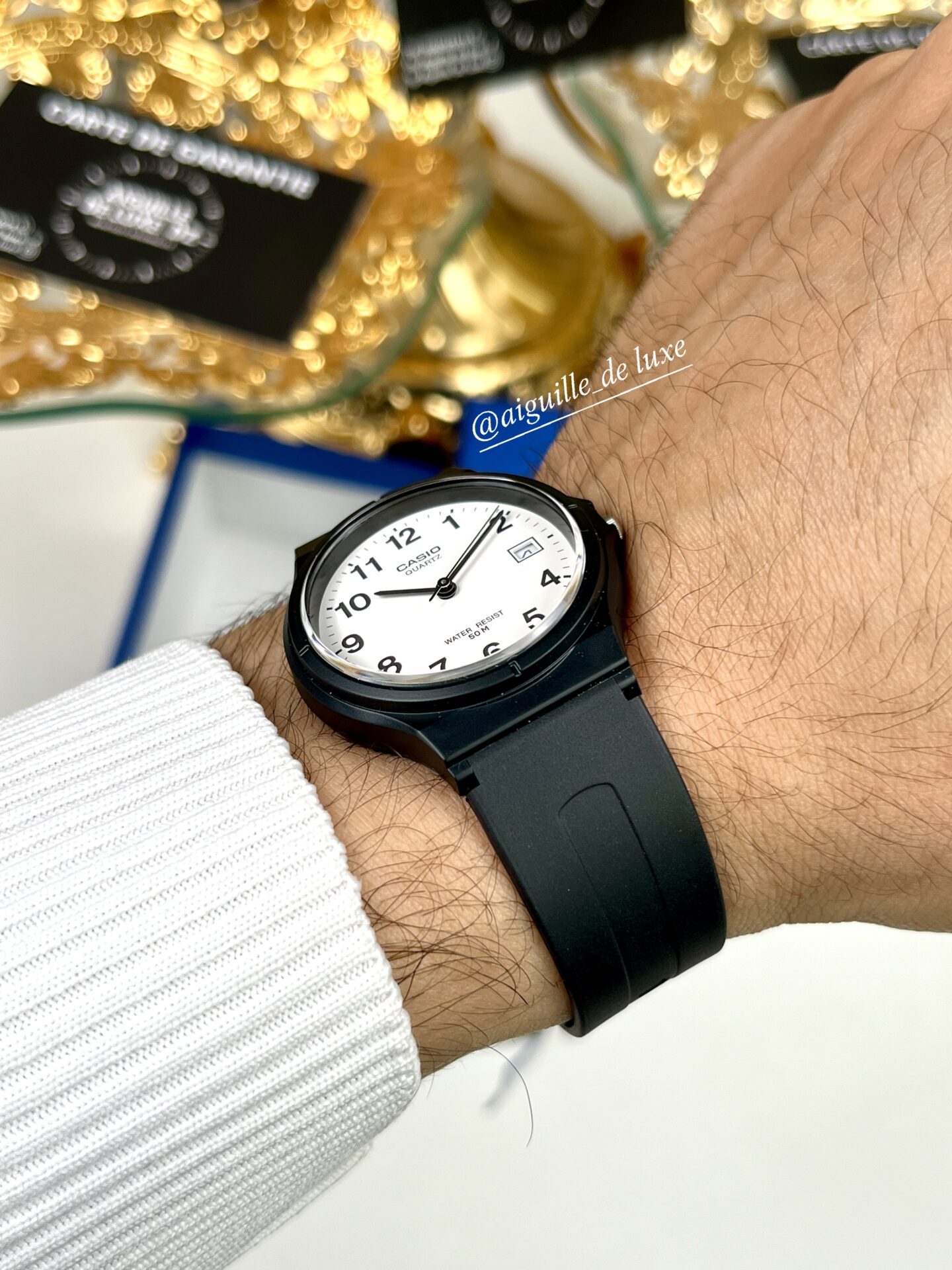 La Casio MW‑59‑7B est une montre analogique unisexe conçue pour ceux qui privilégient un style classique et pratique. Son cadran blanc contrasté avec aiguilles et index noirs permet une lecture facile et immédiate de l’heure, même dans des conditions de lumière variables, tandis que la petite fenêtre de date ajoute une fonctionnalité utile au quotidien.