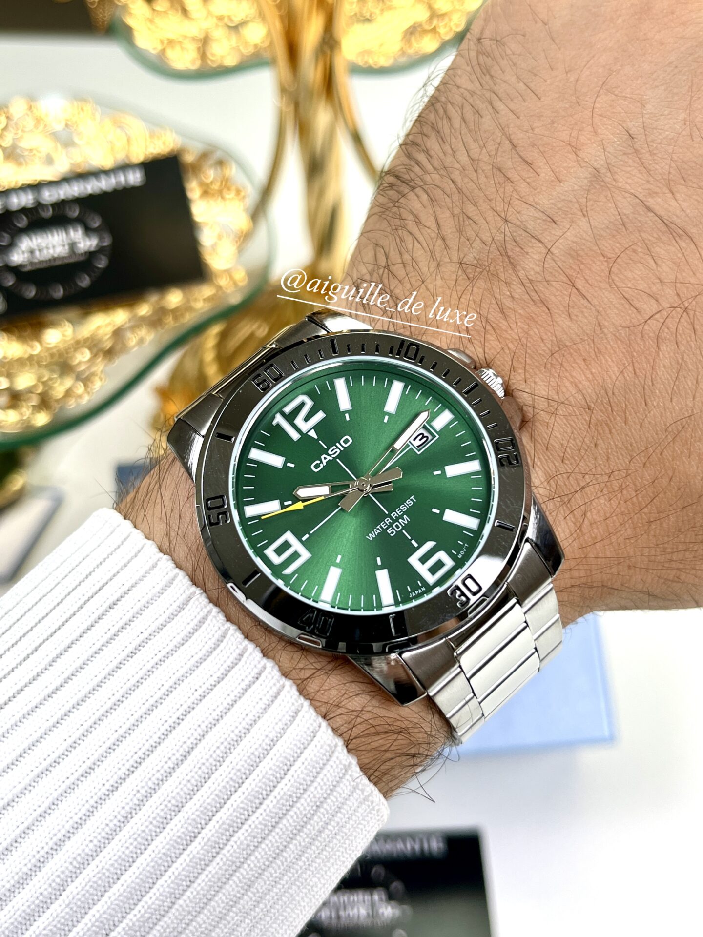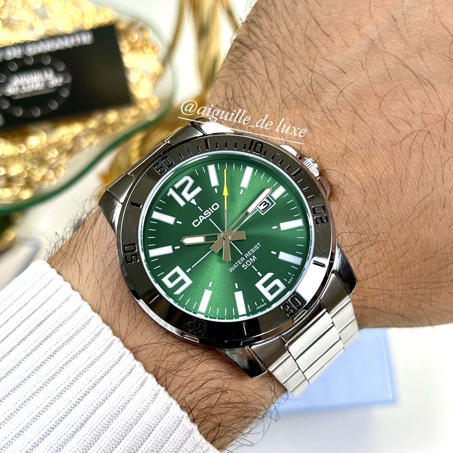 Casio MTP-VD01D-3BV, montre homme moderne en acier inoxydable avec cadran vert distinctif, résistance à l’eau de 50 m, idéale pour un usage quotidien élégant.