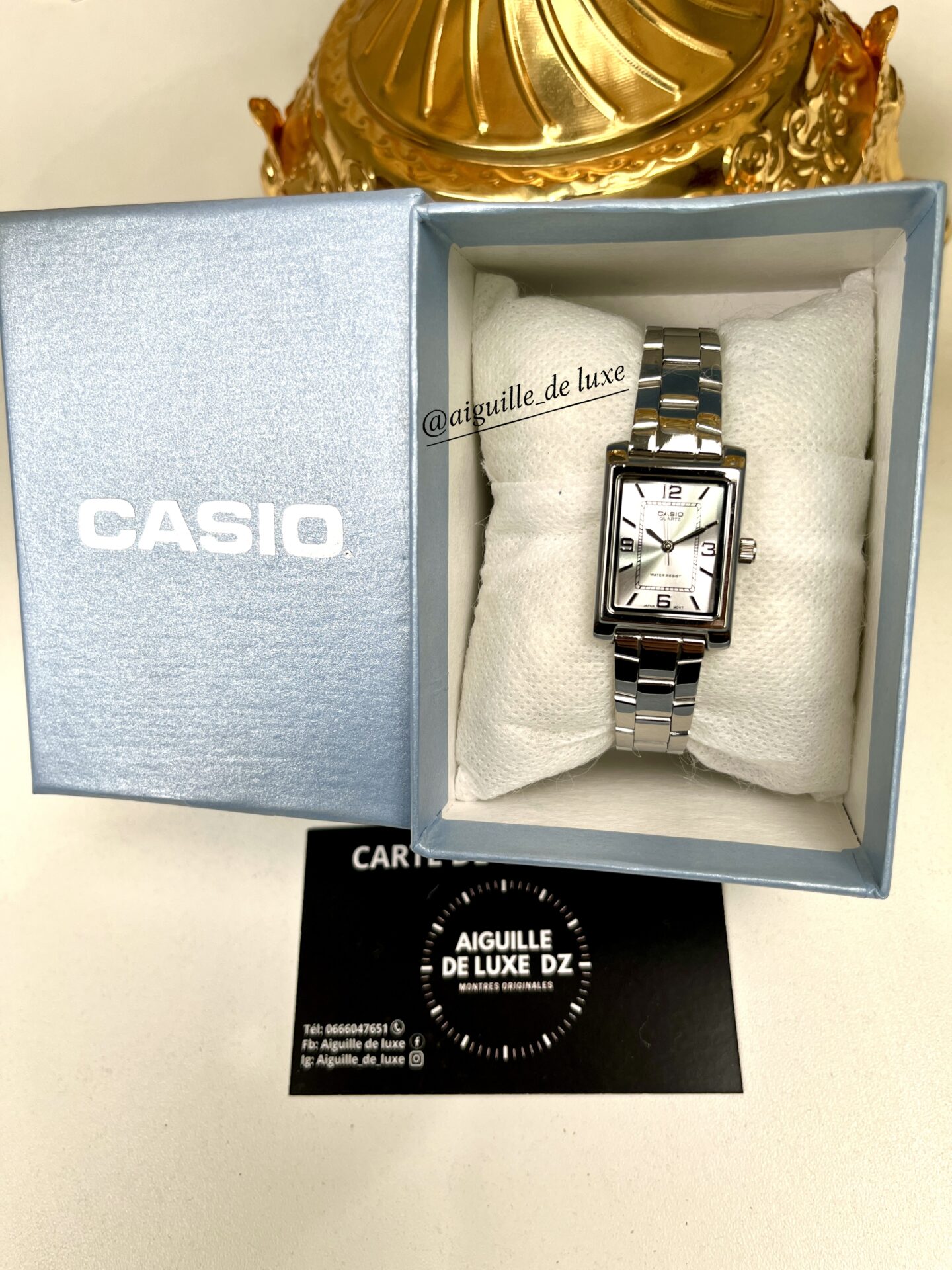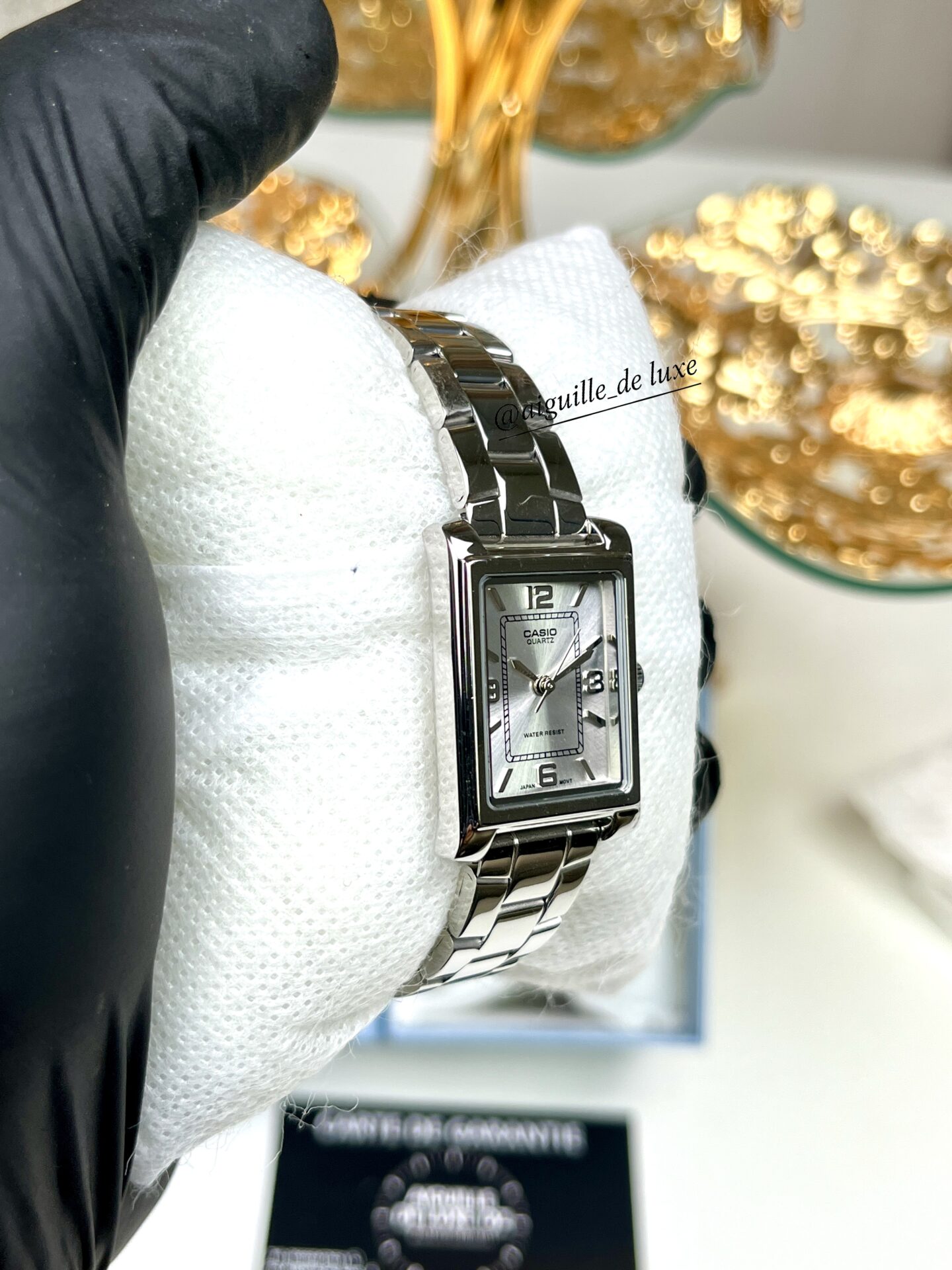 La Casio LTP-1234DD-7A est une montre féminine en acier inoxydable argenté avec un cadran blanc rectangulaire et un design élégant. Résistante à l’eau jusqu’à 30 m, elle allie raffinement et praticité.
